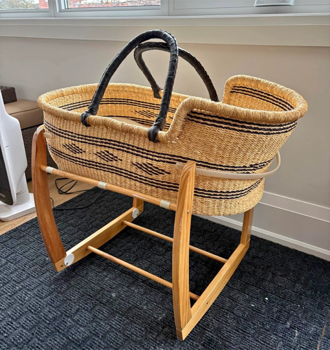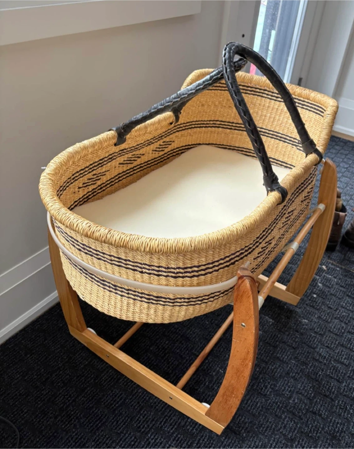 A hand-woven Moses basket bassinet featuring a natural straw colour with black striped accents. It's mounted on a sturdy wooden rocking stand for gentle motion. Includes a comfortable, padded mattress.