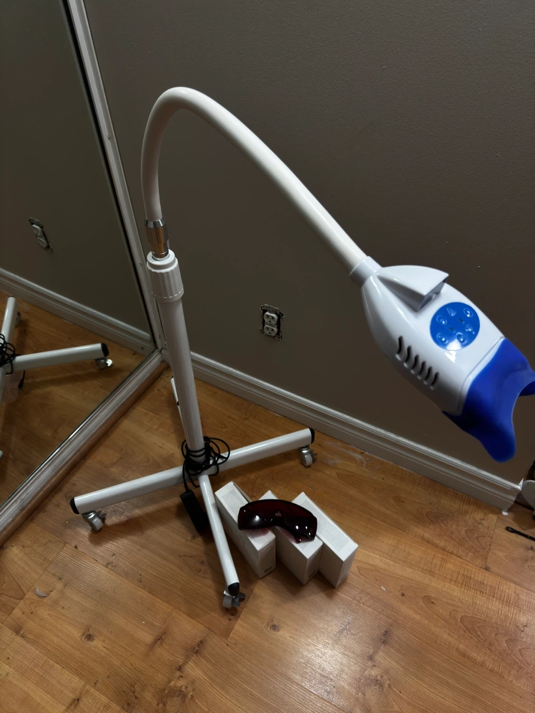 LED teeth whitening machine with three kits. It includes the main unit, a stand with wheels, and protective eyewear. The LED lamp is adjustable and the stand provides easy manoeuvrability.
