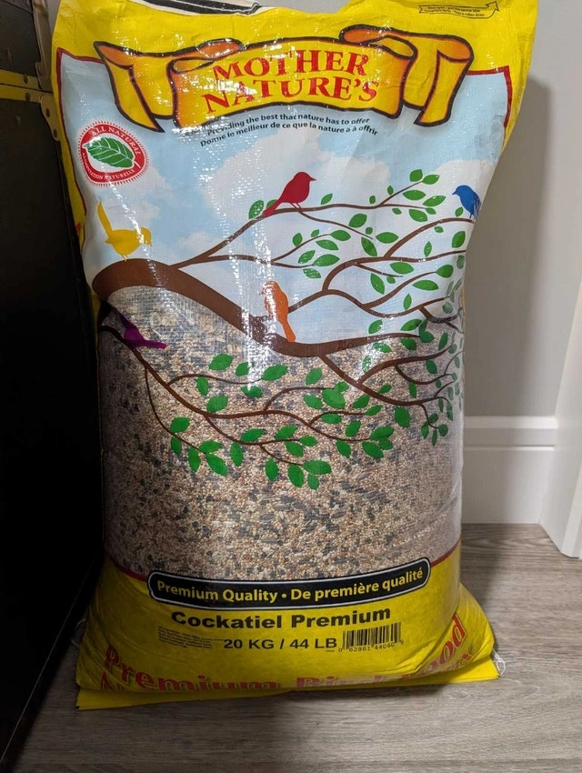 I have a 20 kg (44 lb) bag of Mother Nature's premium cockatiel food. This mix is specially formulated to meet the nutritional needs of birds, ensuring their health and vitality.