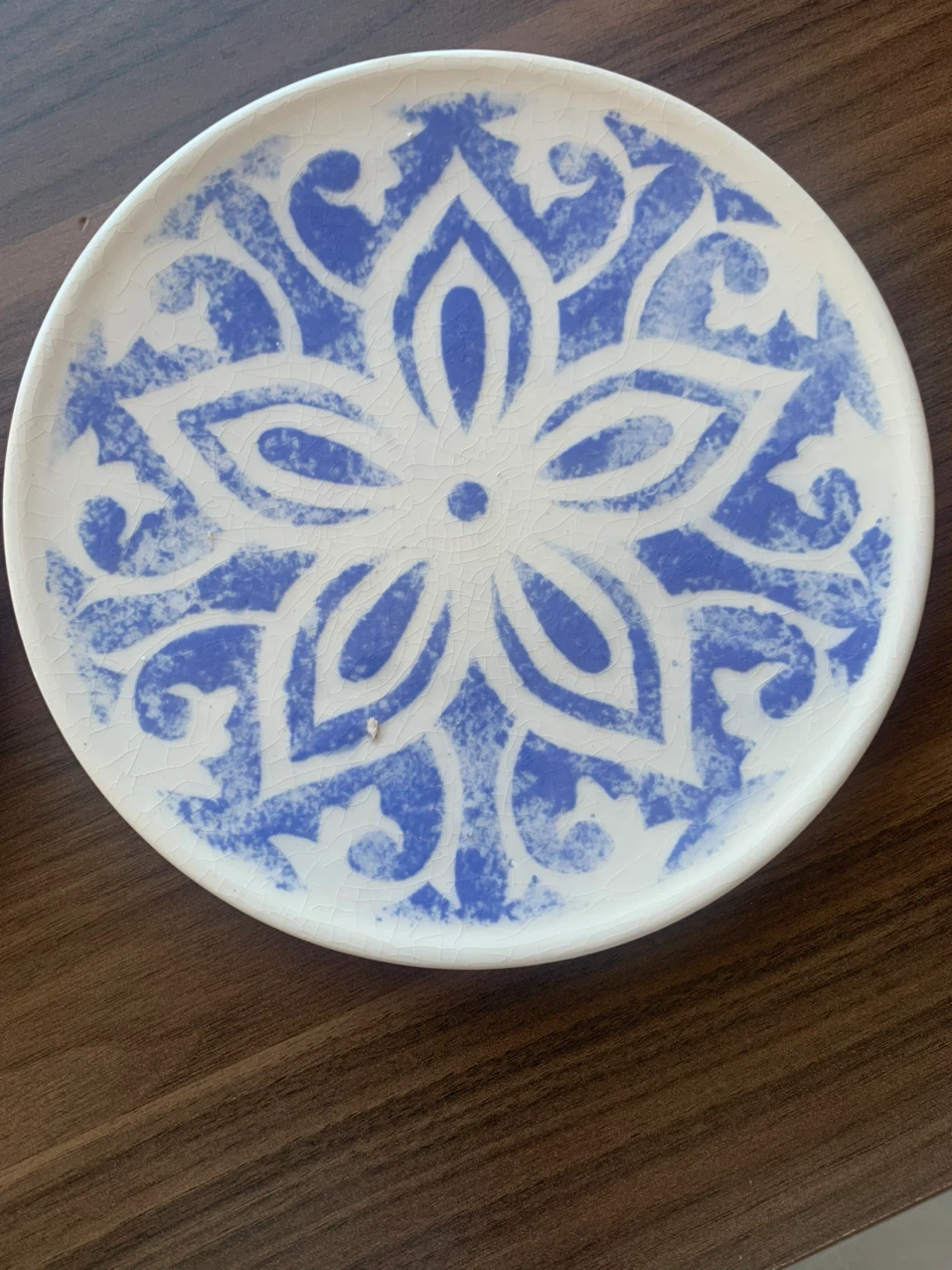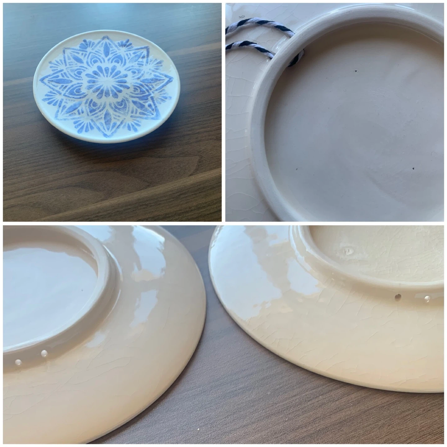 Selling a set of two decorative ceramic plates. Each plate features a unique blue and white mandala-style design. These are great for display or for serving small snacks!