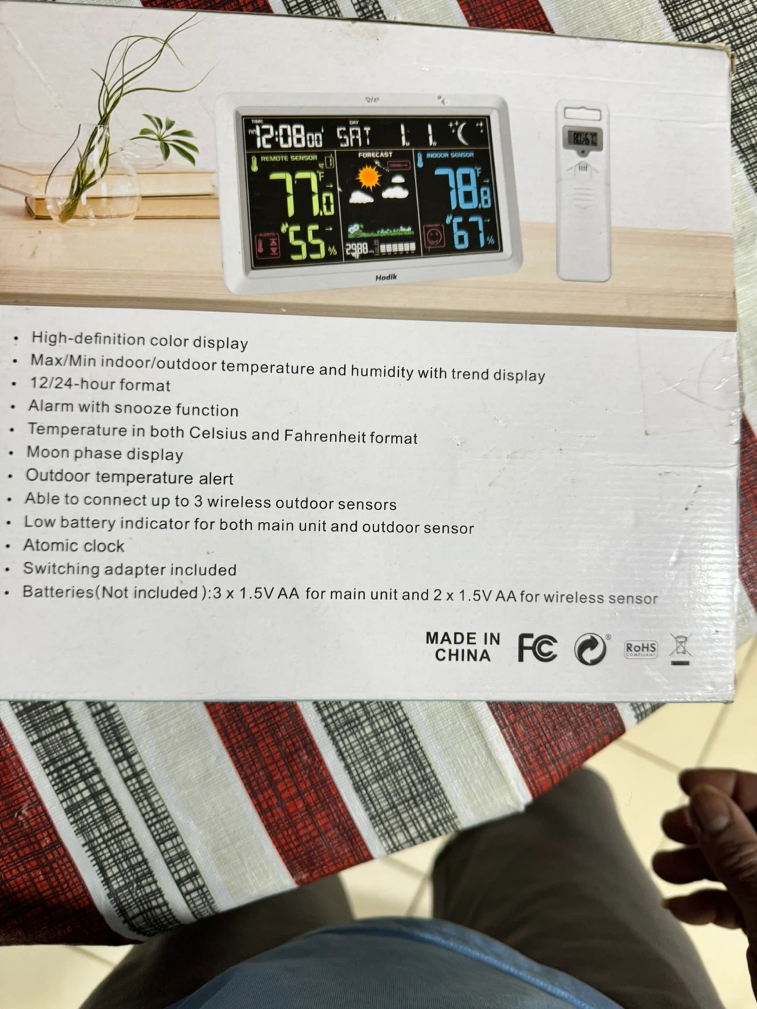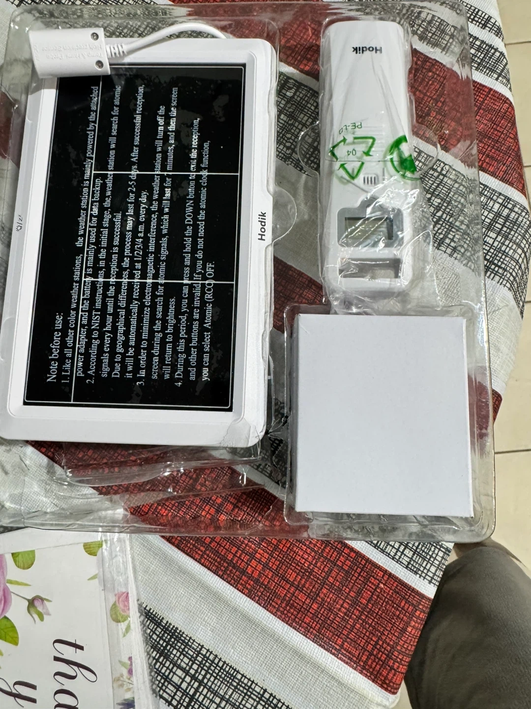 This Hodlik digital weather station displays indoor and outdoor temperature and humidity. It features a 12/24-hour format, alarm with snooze, and an atomic clock. The package includes the main unit, a wireless outdoor sensor, and a switching adapter.