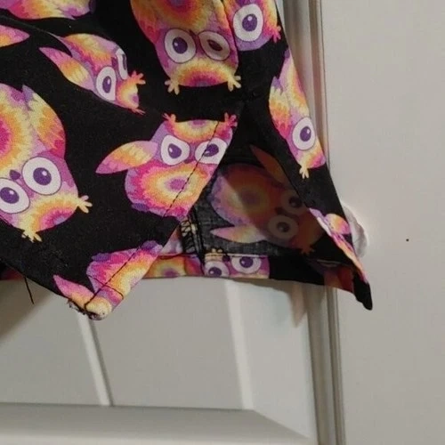 EUC White Cross Owls pattern Pediatric nurse scrubs top uniform shirtShort sleeve Black and orange mostly Pattern part 100 % cotton Black part stretchyTwo pockets Approx measurements Pit to pit 19 inBack length 25 in