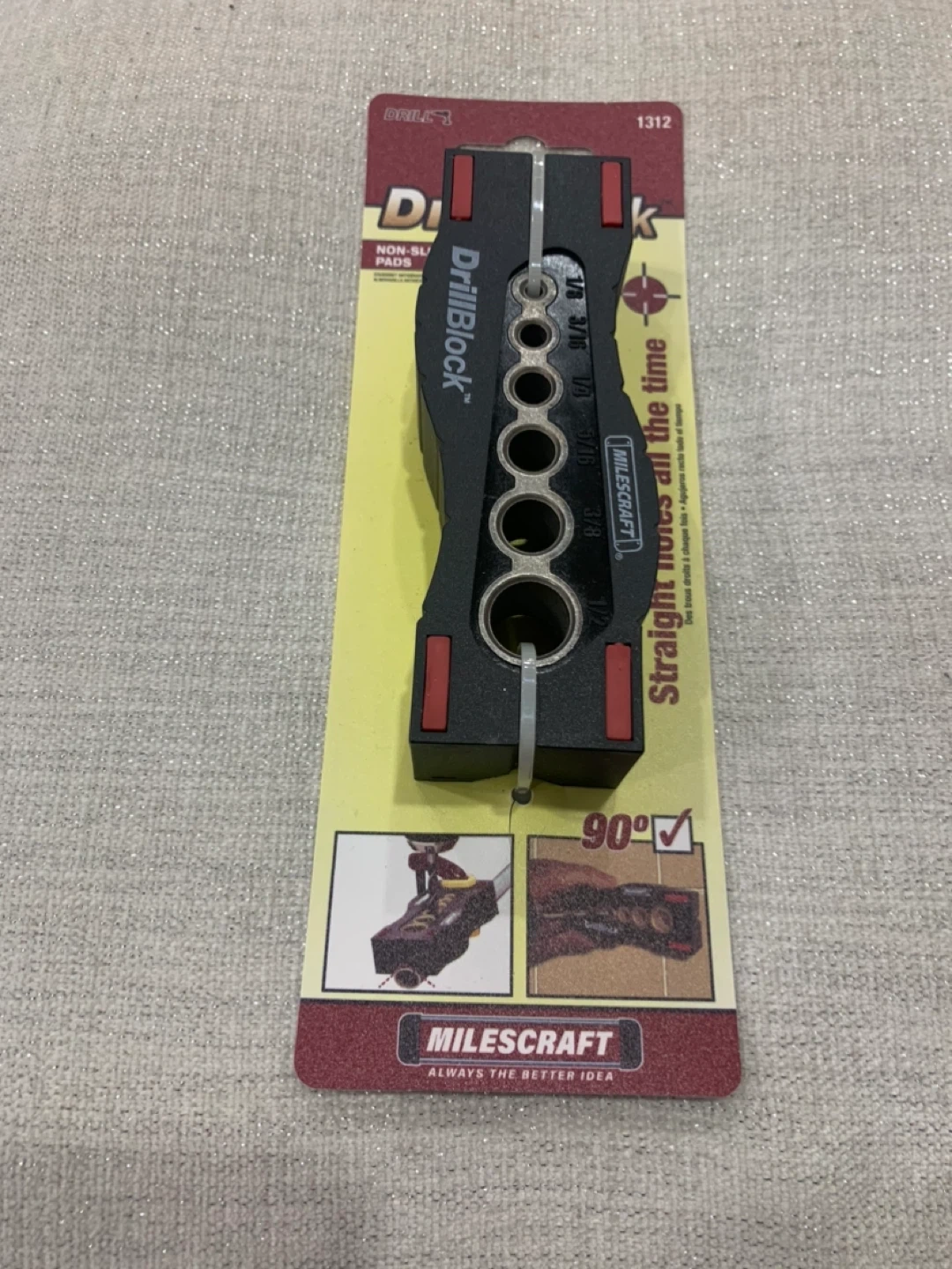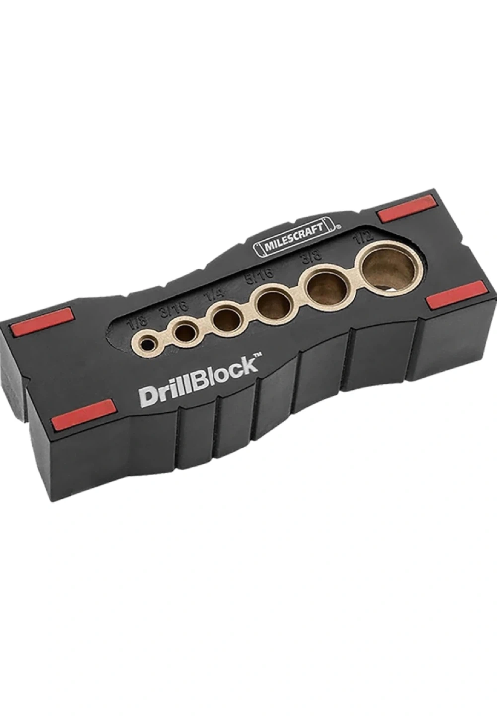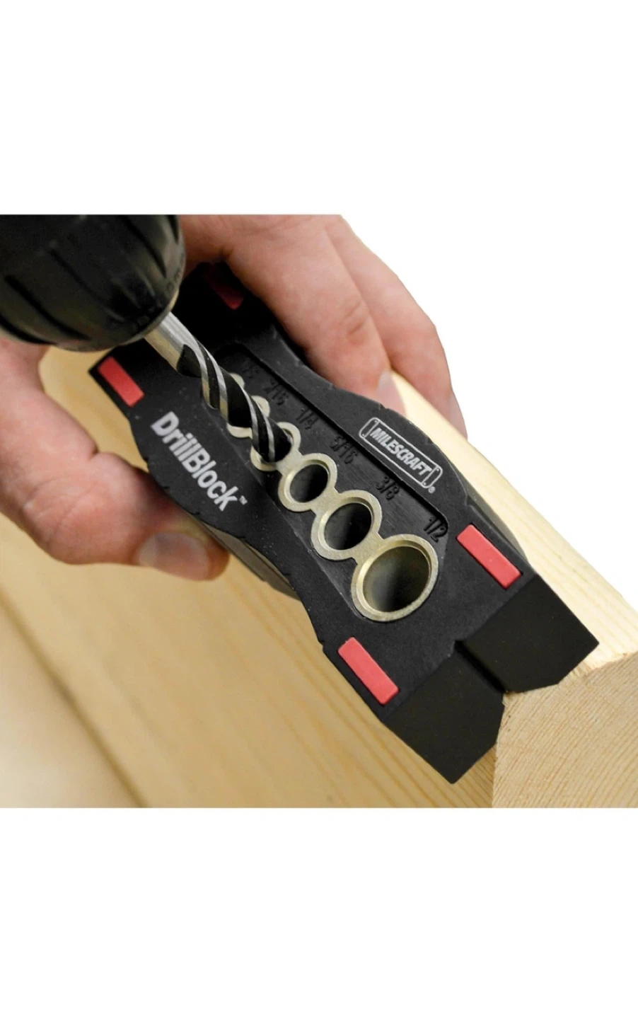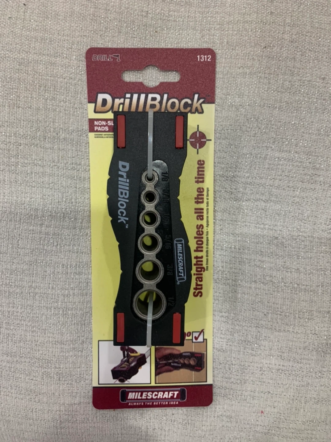 This Milescraft DrillBlock is designed for making straight holes every time. It has six common drilling diameters: 1/8", 3/16", 1/4", 5/16", 3/8", and 1/2". The V-groove allows for drilling on corners or round surfaces, and TPE feet prevent slipping and marring. Built-in center lines ensure accurate alignment.