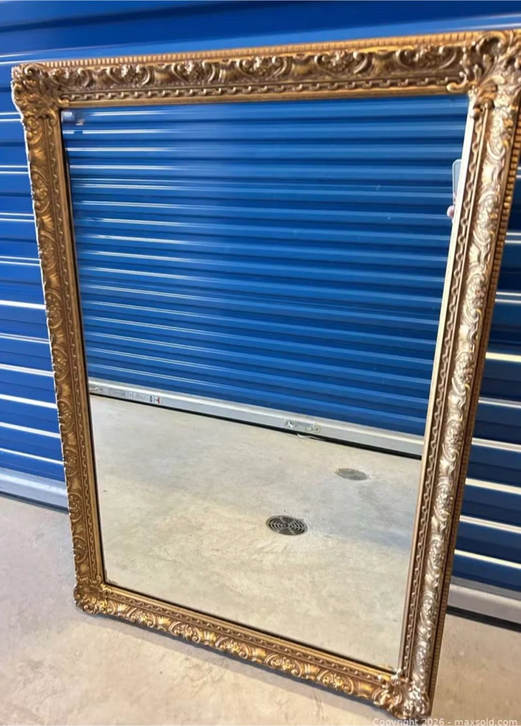 This is a decorative wall mirror with an ornate gold-finished frame. The frame features intricate detailing and a vintage-inspired design. It's a substantial piece that can add a touch of elegance to any room.