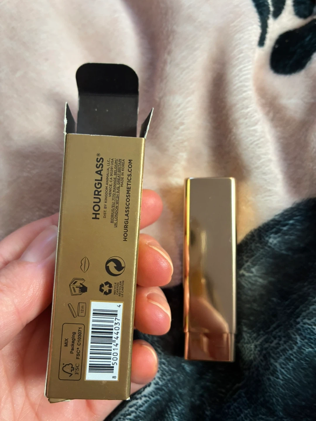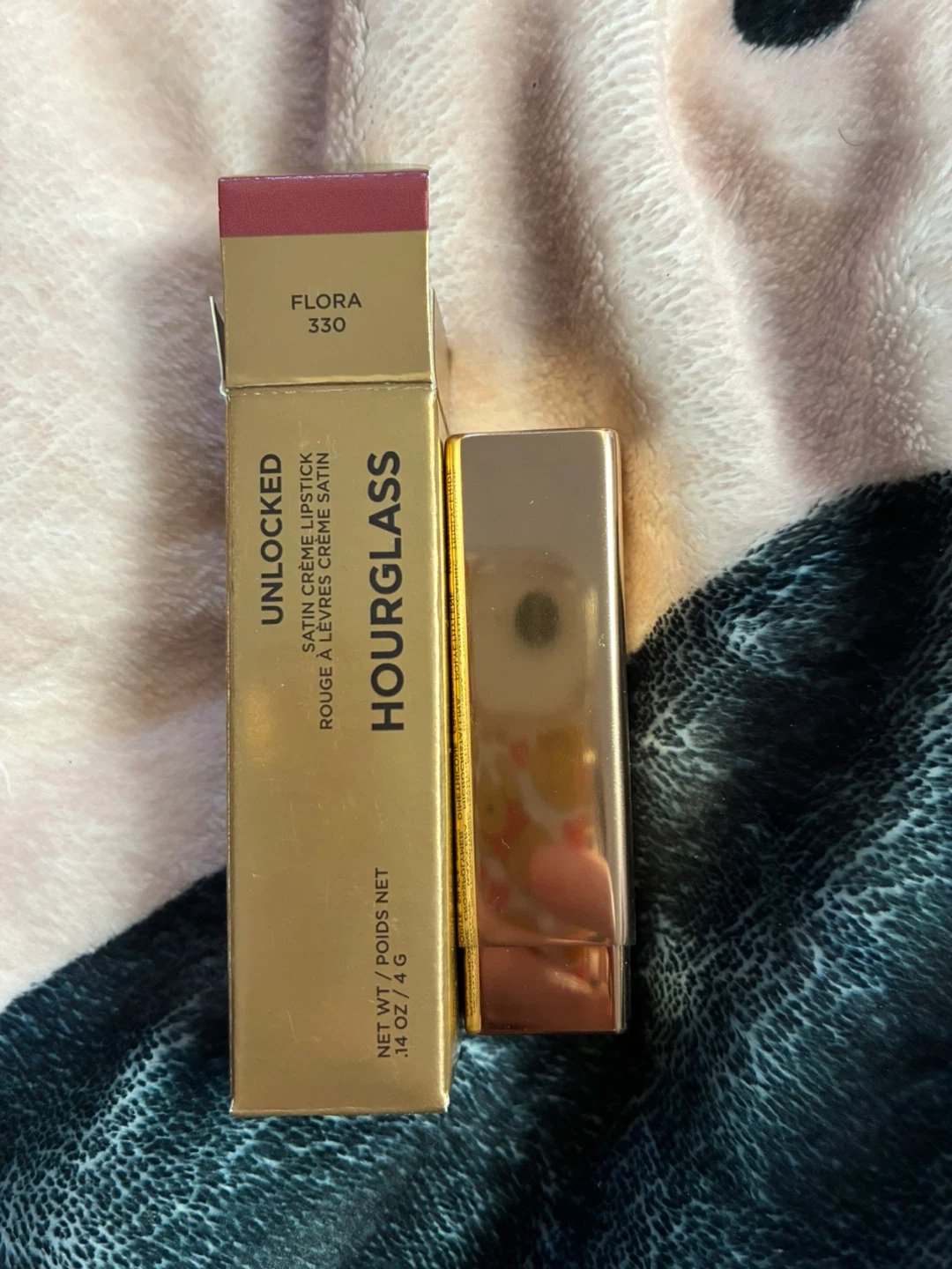 This is the Hourglass Unlocked Satin Creme Lipstick in shade Flora 330. It's a satin creme lipstick formula. Net wt 0.14 oz / 4g.