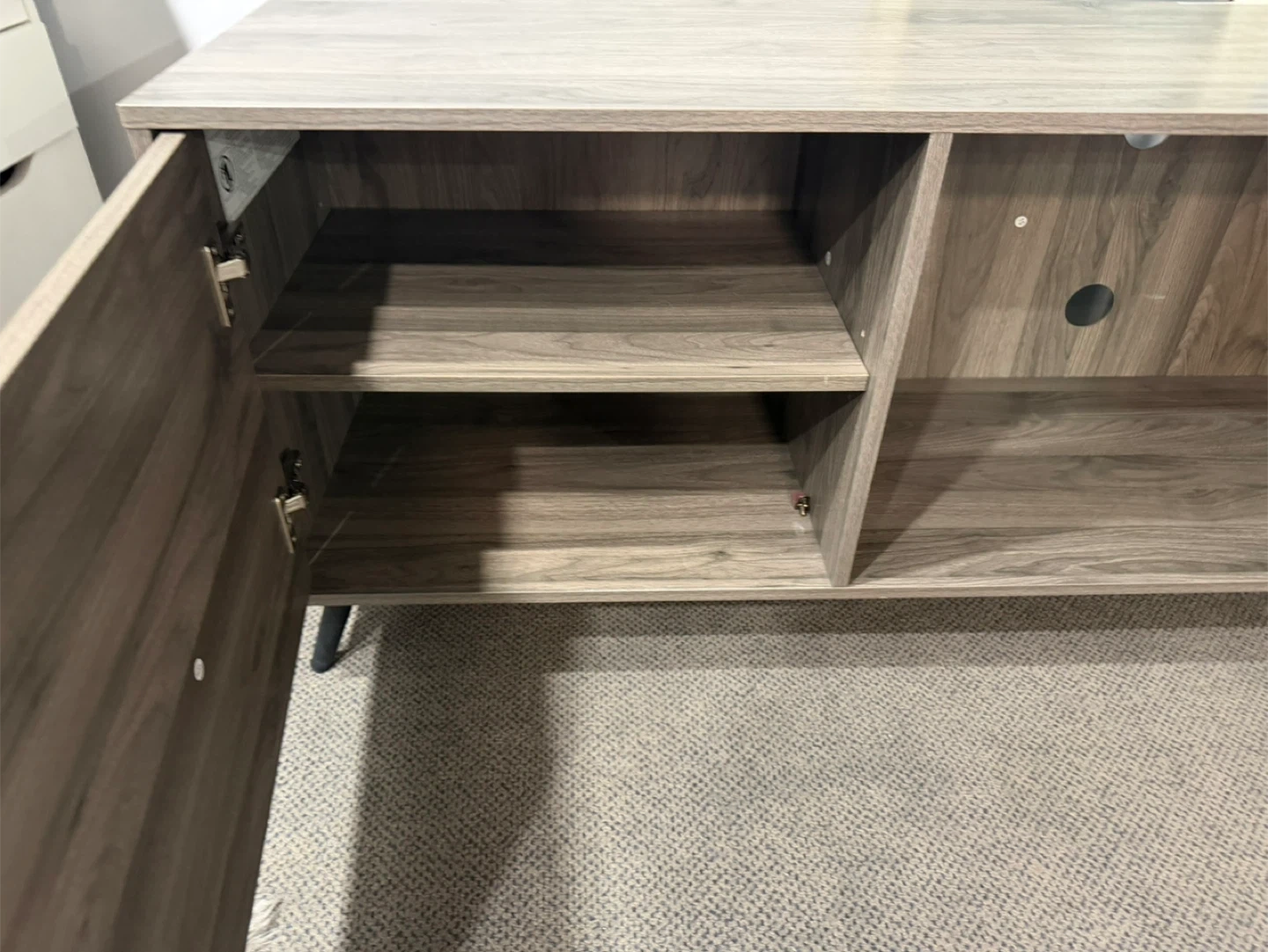 This TV stand features a wood grain finish and a cabinet with shelving. It has an open compartment with a cable management hole. It's great for organizing your entertainment setup!