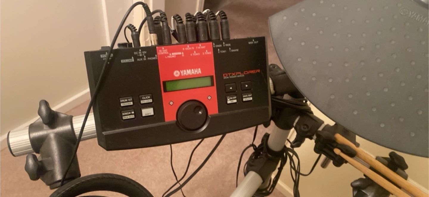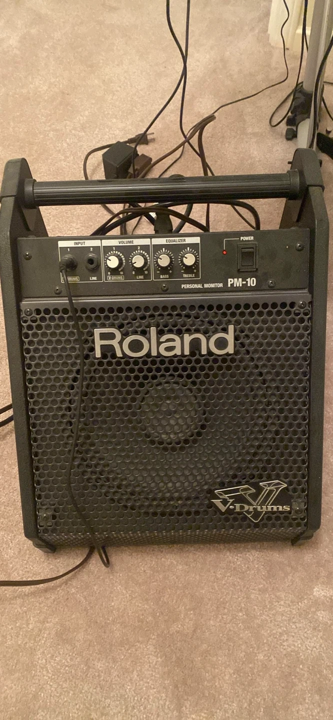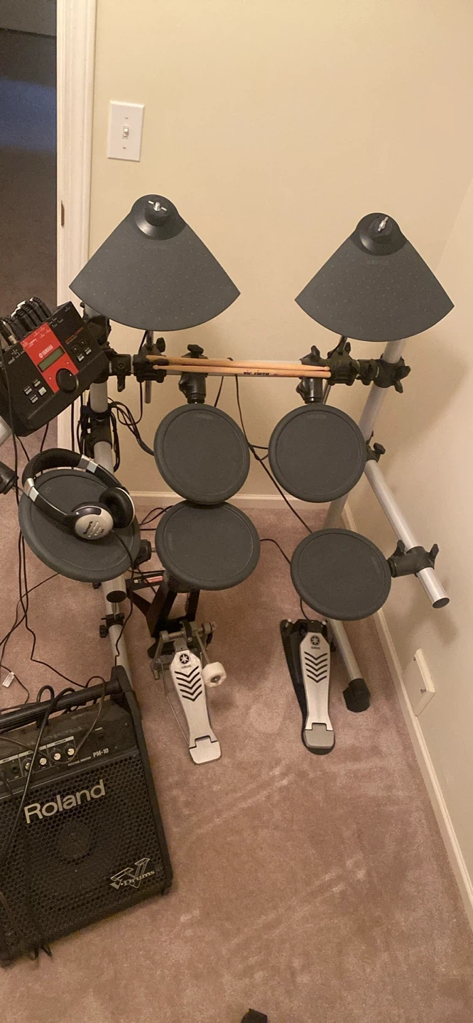 This is a Yamaha electronic drum kit, perfect for practice or small gigs. It includes a Roland PM-10 personal monitor amplifier and a pair of headphones. The kit features multiple drum pads and cymbal pads, along with kick and hi-hat pedals. It's a great setup for any drummer looking to expand their sound options!