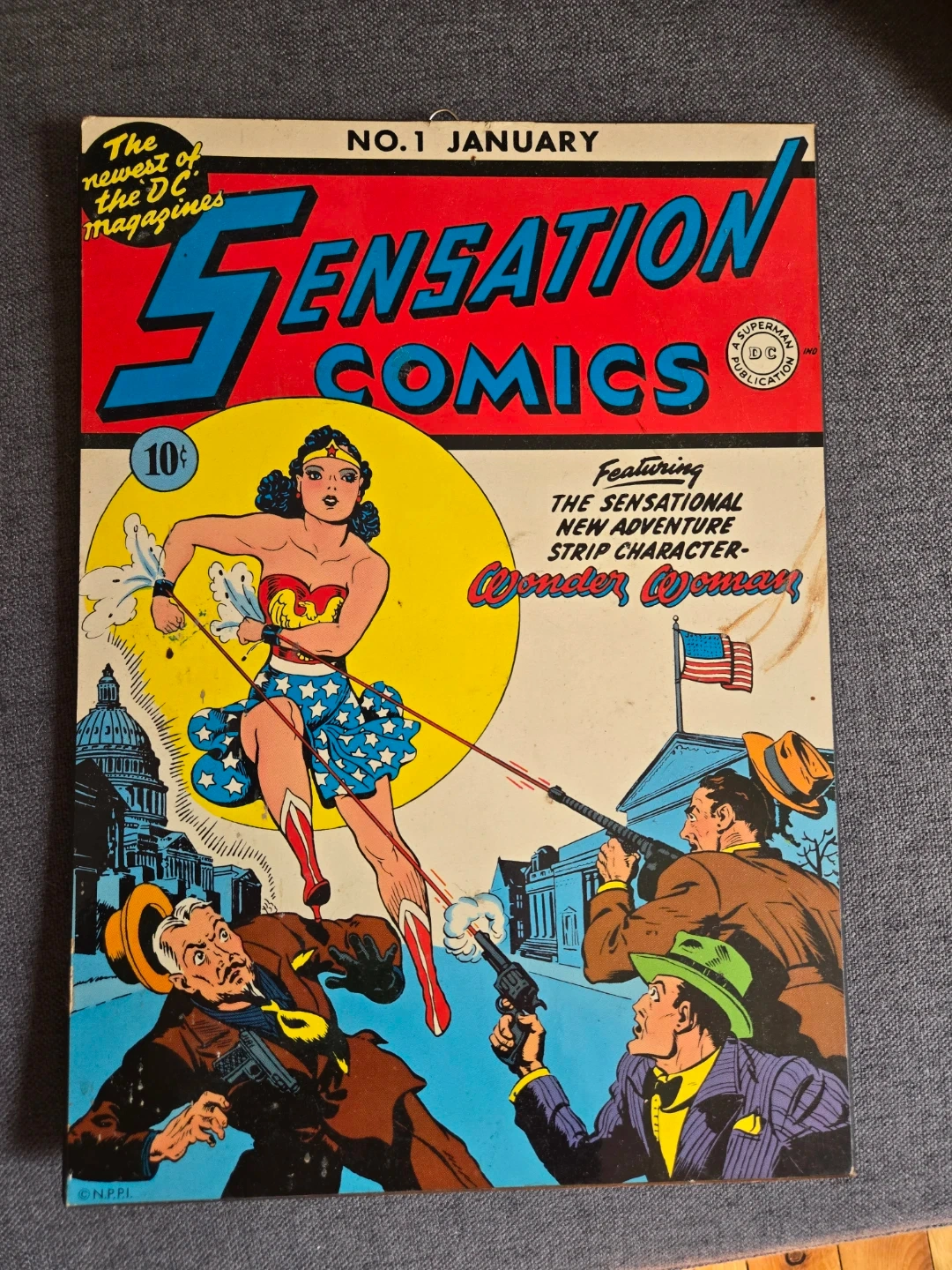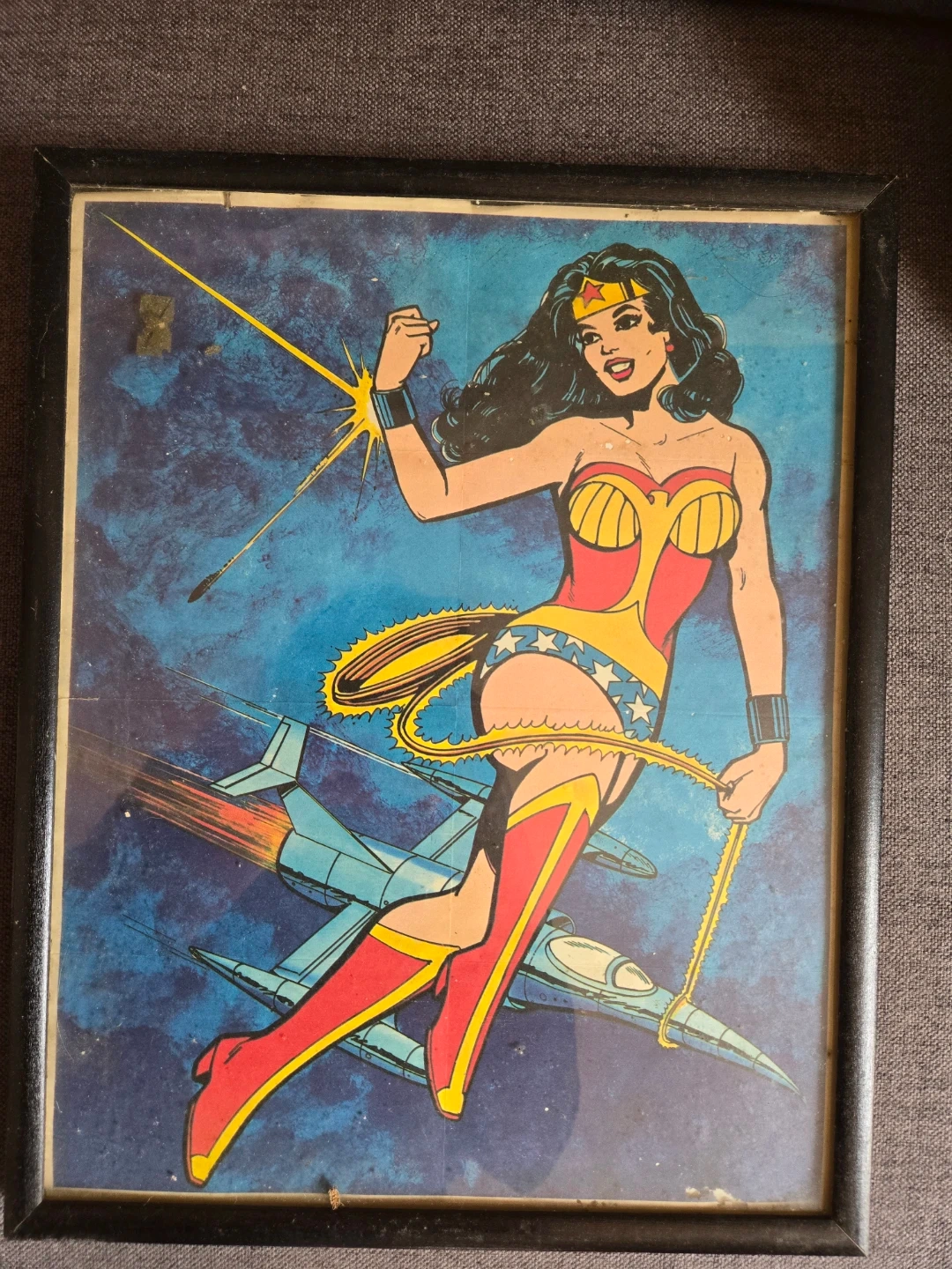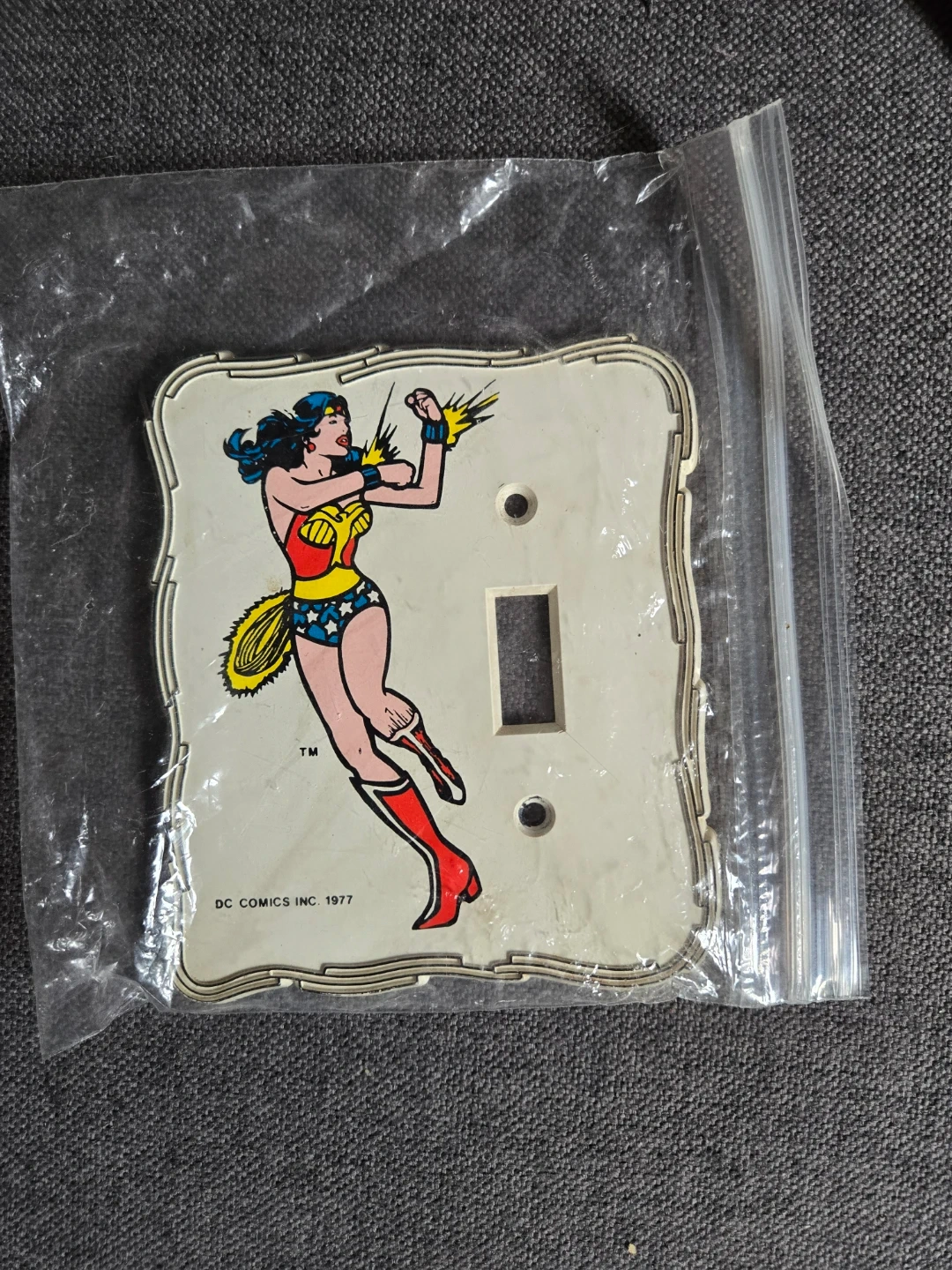 Vintage Wonder Woman light switch plate cover featuring classic comic art. This lot includes 1 framed picture of wonder woman and a Wonder woman set on wood with a loop to hang it on the wall.