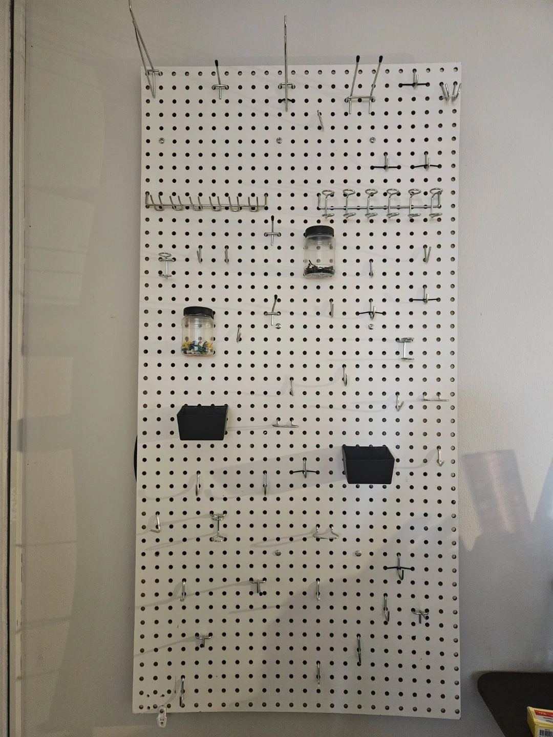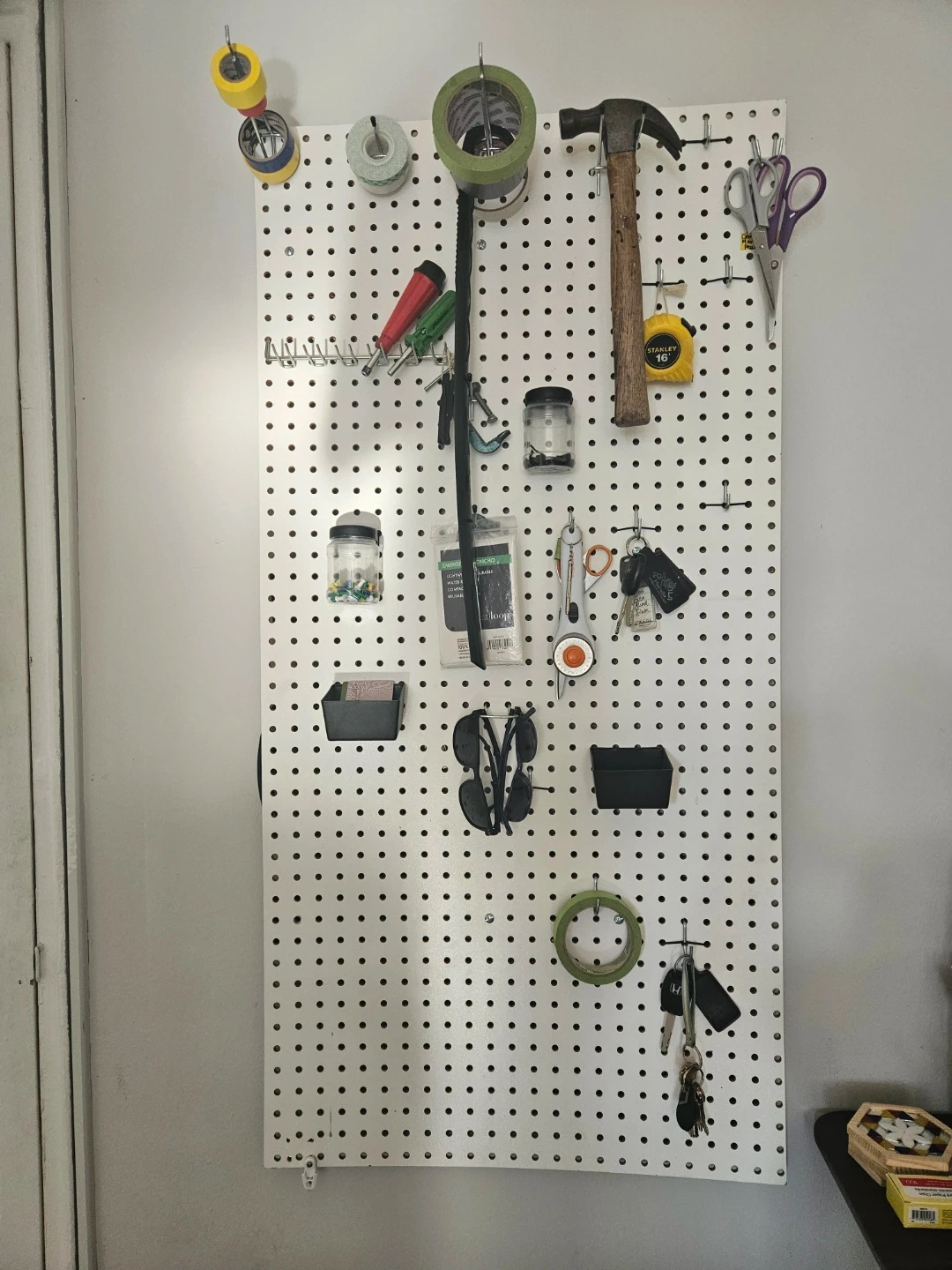 This is a pegboard organizer with a variety of accessories. It's ideal for keeping your workspace tidy and tools accessible. Includes assorted hooks, small containers, and, jars with fasteners.