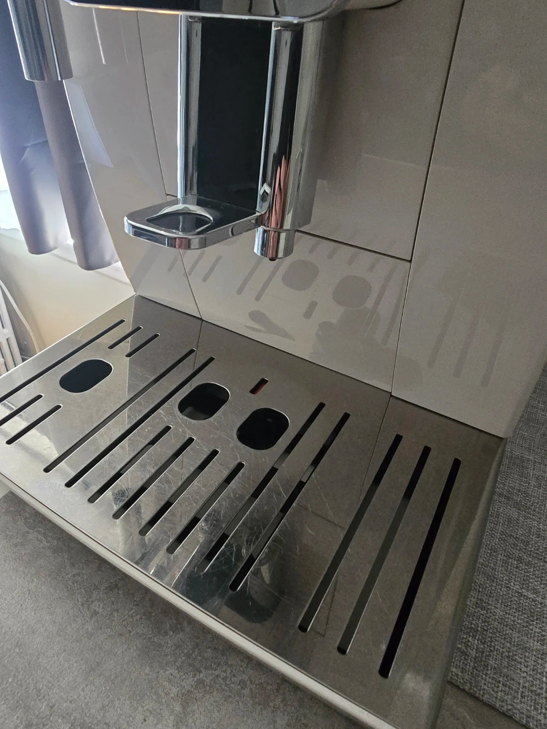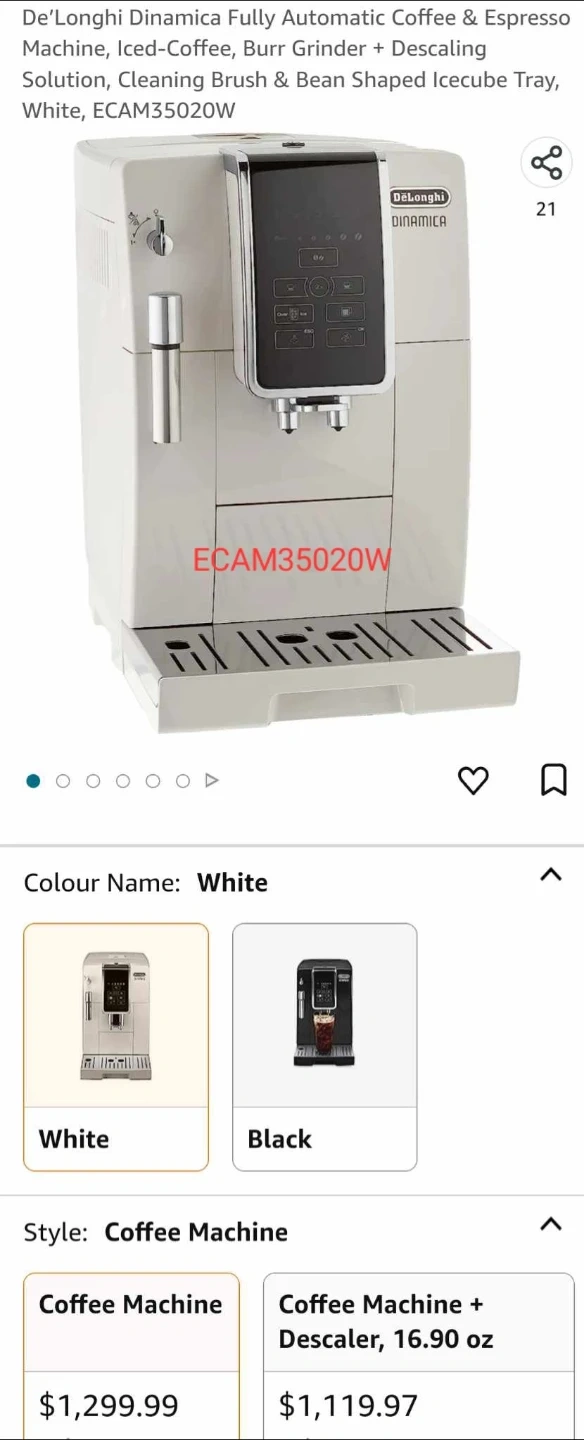 This De'Longhi Dinamica features a fully automatic coffee and espresso system. It includes a burr grinder and a descaling solution. White colour.