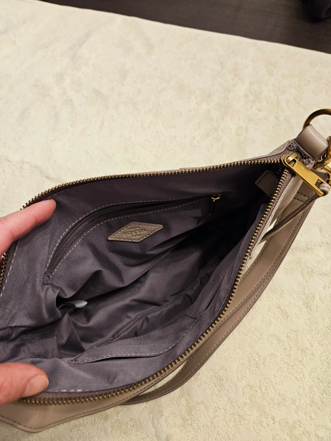 This is a light mauve leather Fossil shoulder bag. It has a zip-top closure and an adjustable strap. Bag dimensions: 28cm x 20cm x 8cm. Perfect for everyday use!