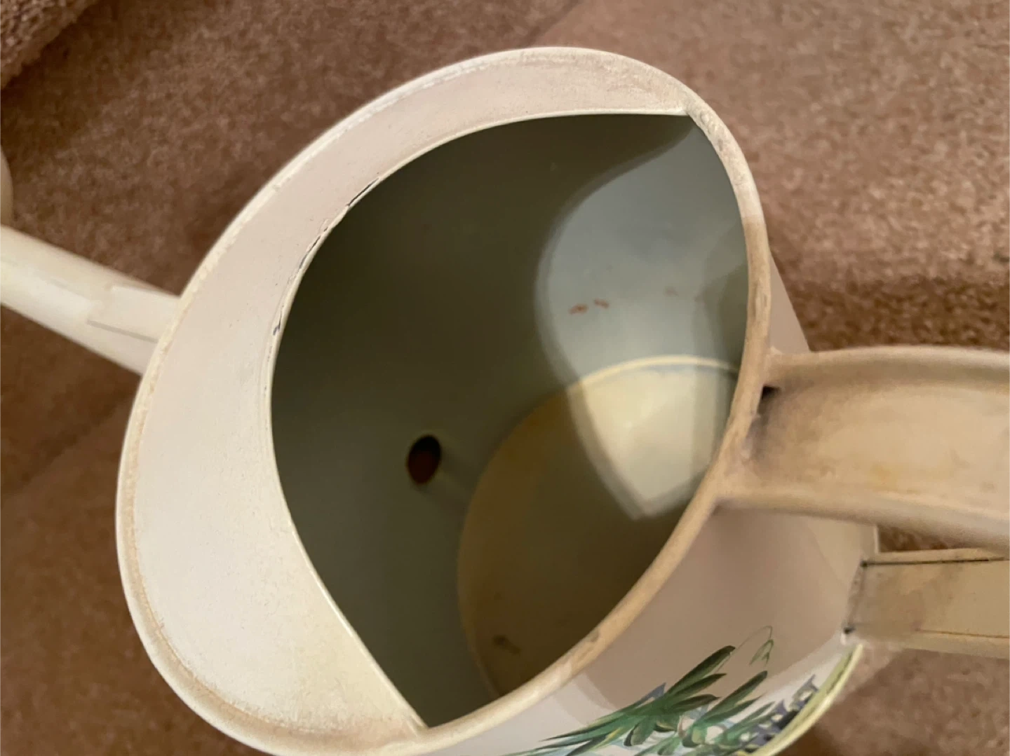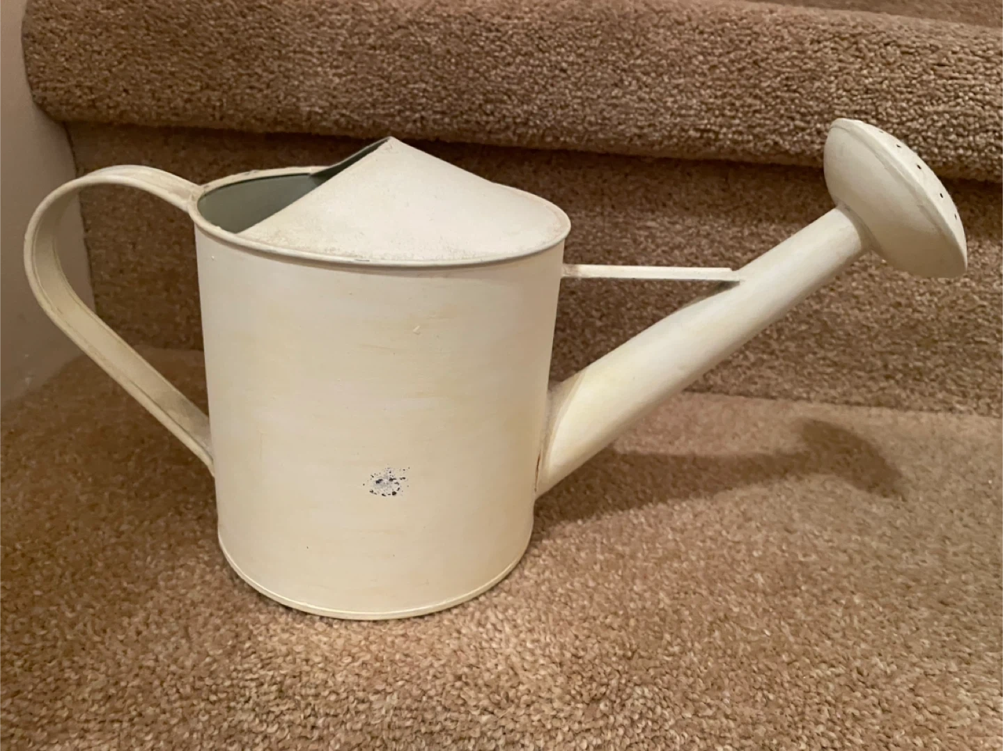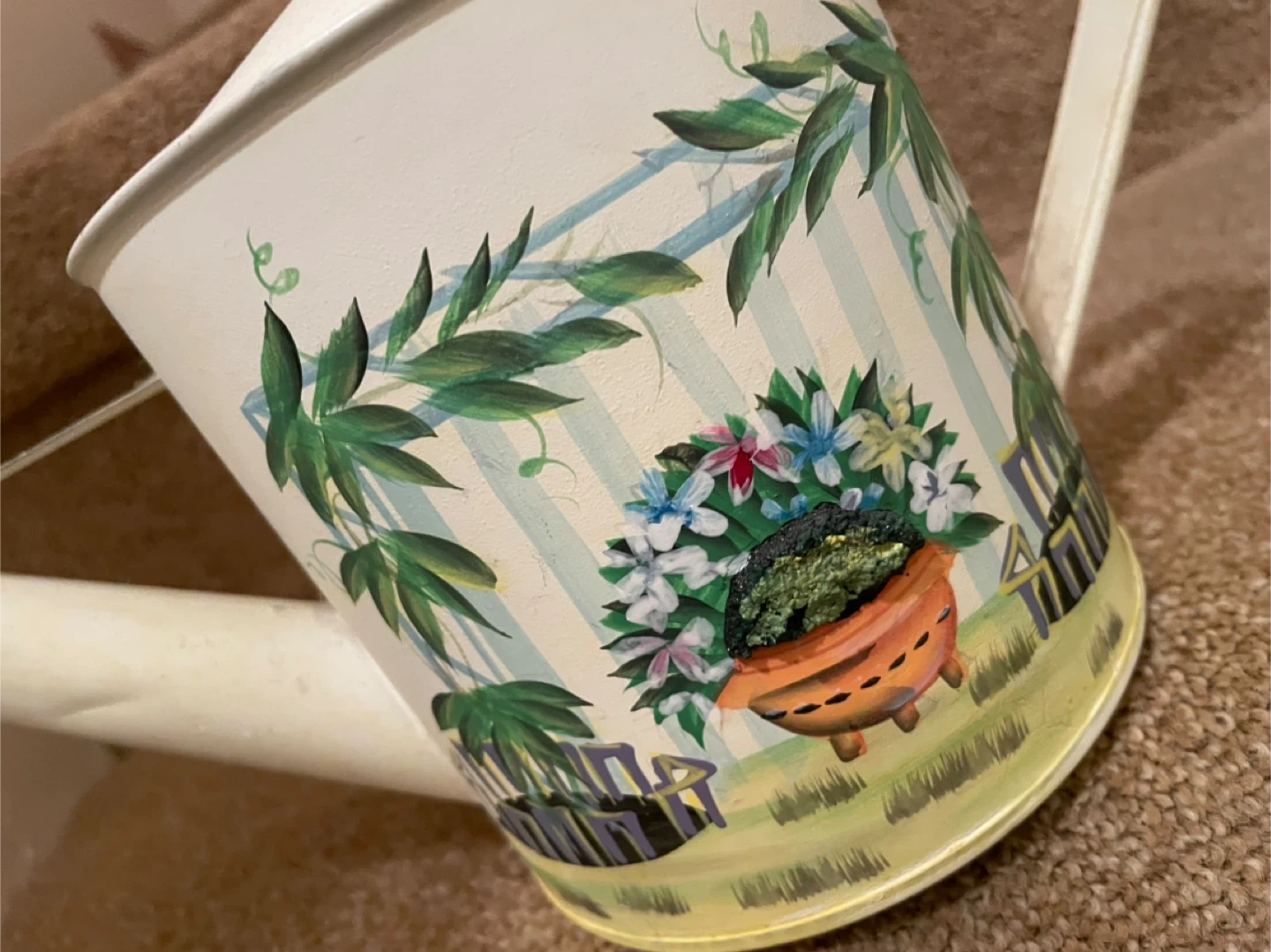 This decorative watering can is painted with a charming floral scene and fencing. It's made of metal and features a classic spout and handle. Great for adding a touch of garden charm to your home or patio!