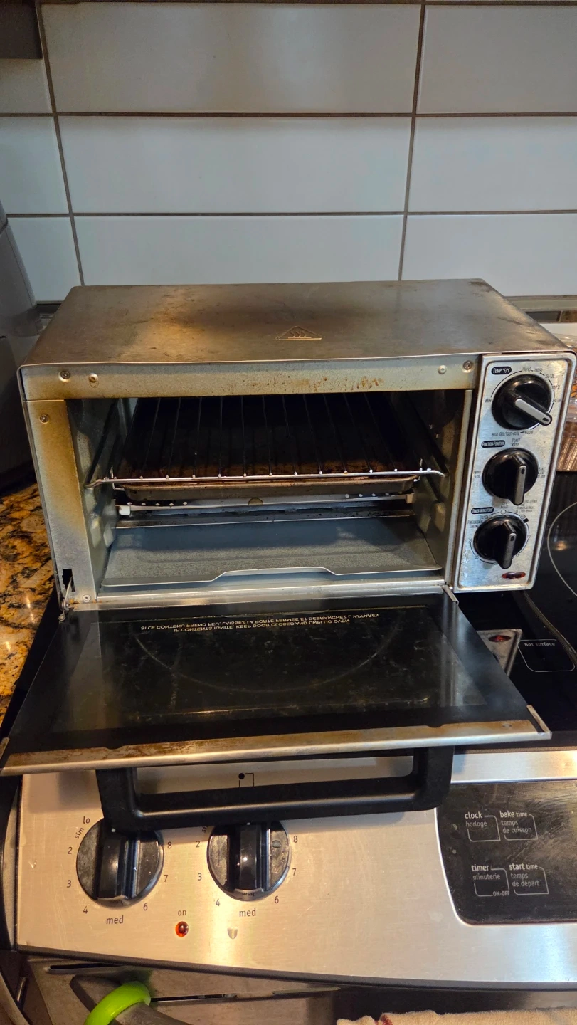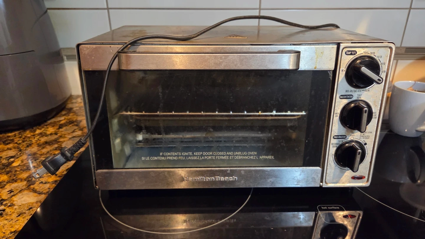 Hamilton Beach toaster oven. It has temperature control and timer functions. This oven is handy for baking, broiling, and toasting small meals.