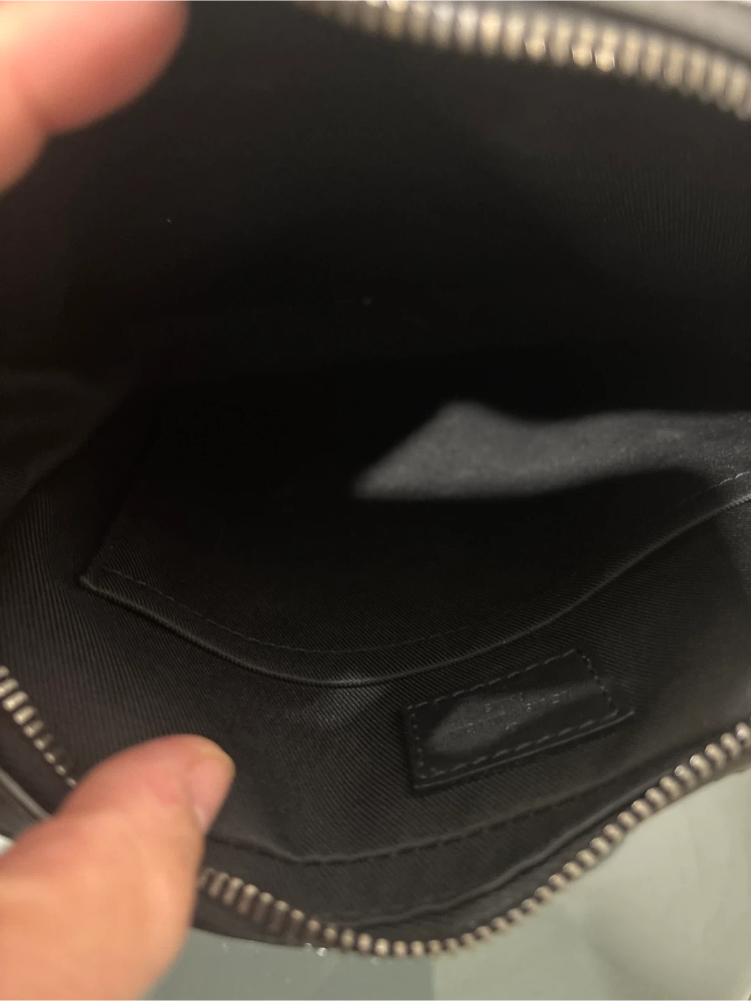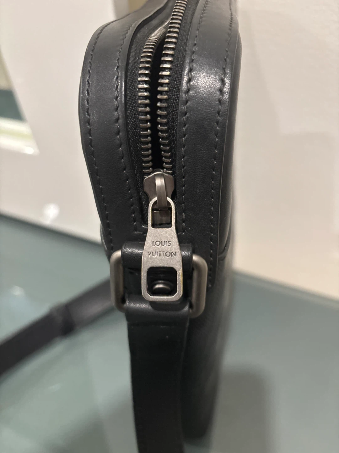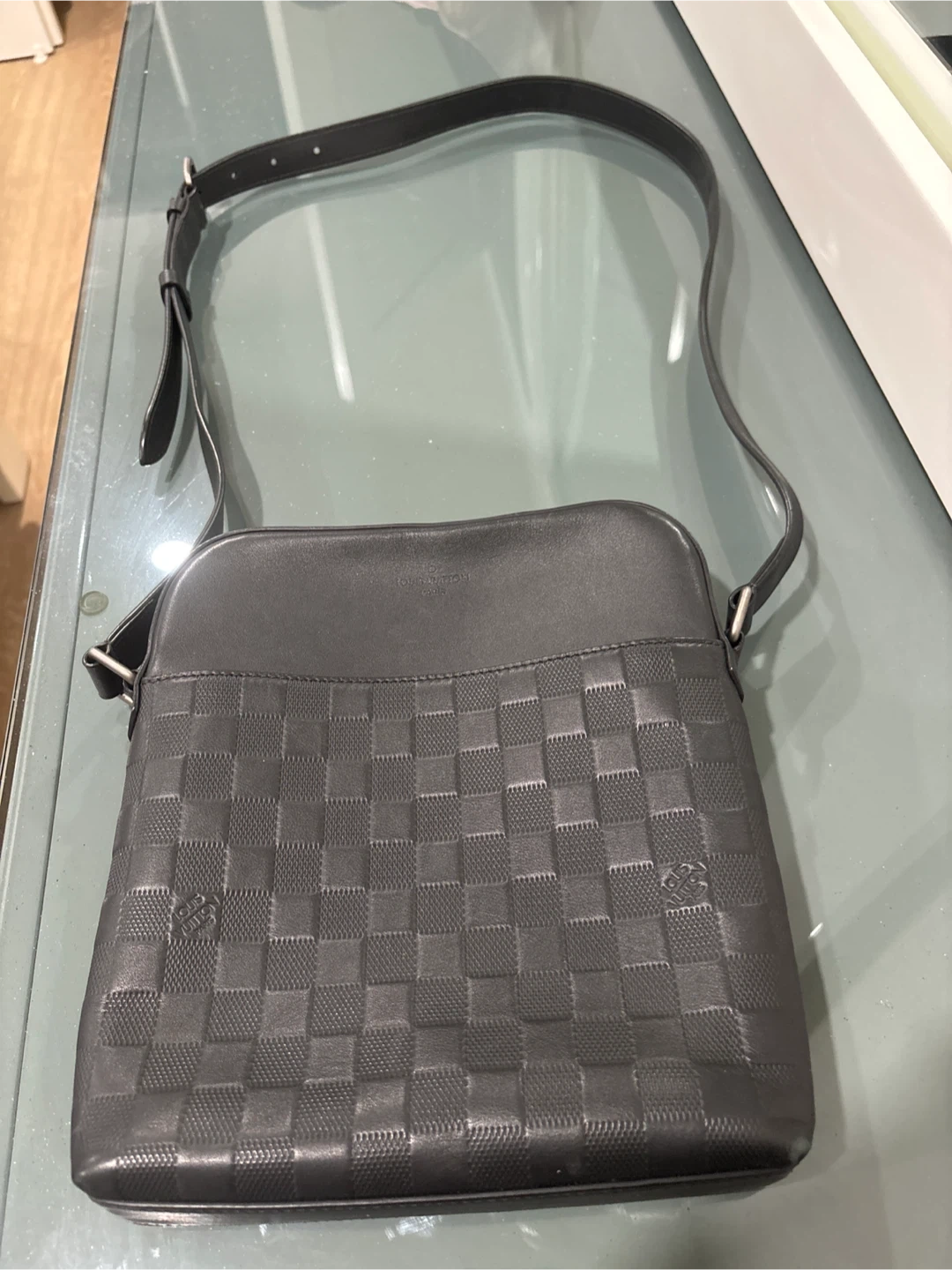 Black leather Louis Vuitton crossbody bag. Features the Damier pattern embossed on the front and a leather strap. Interior has one main compartment and a small pocket. Zipper closure. Bought it in Toronto and husband used it once and doesn’t like the size. Perfect condition
