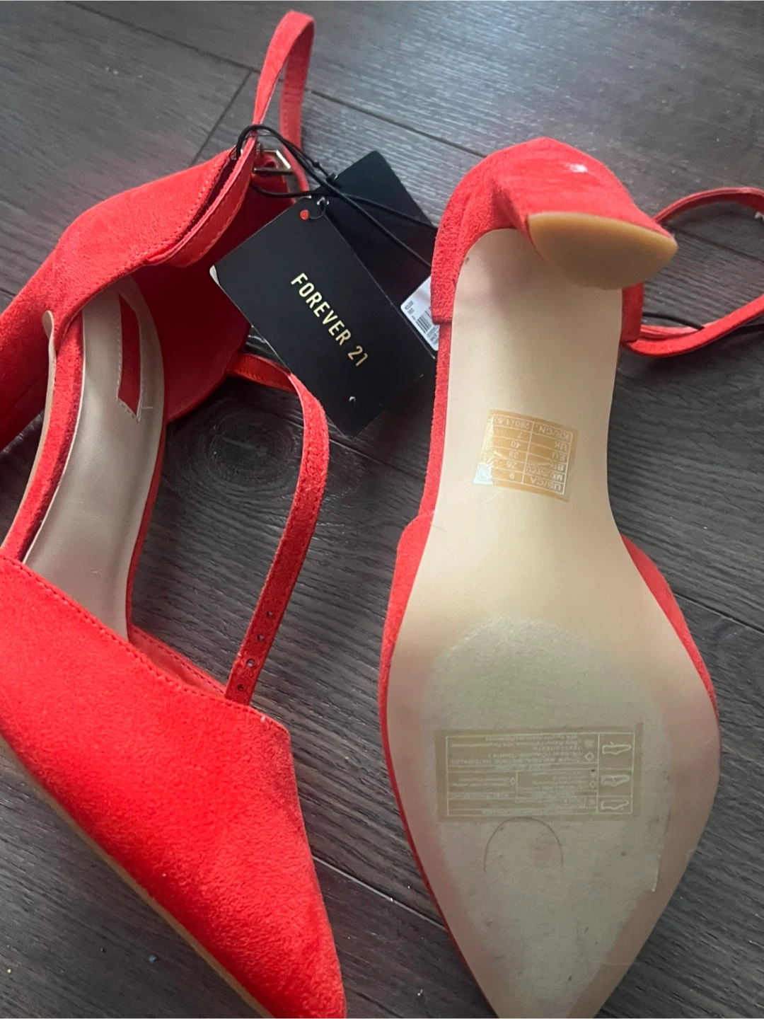 These stylish Forever 21 heels come in a vibrant red suede. They feature a pointed toe and a secure ankle strap for comfort and flair. Made with a synthetic upper and sole.