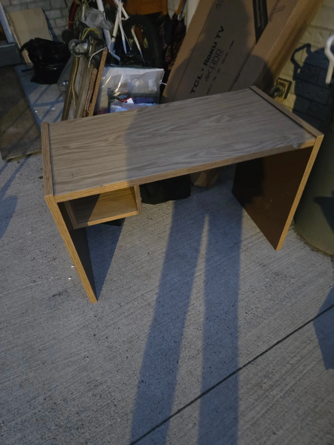 A simple wooden desk with a built-in shelf. This desk is made of particleboard with a wood veneer finish. It's perfect for a small office or study space.