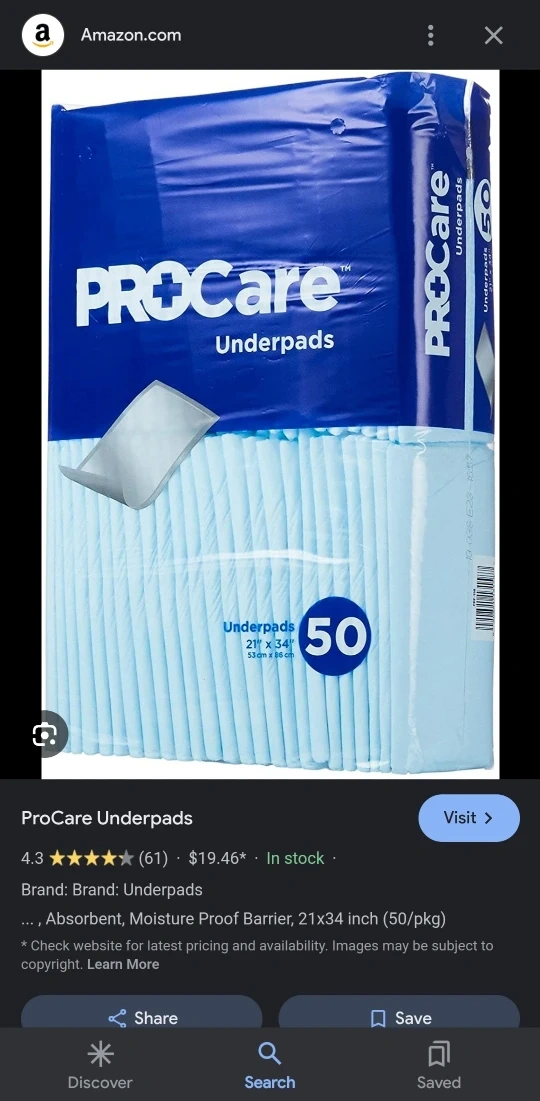 Selling a pack of ProCare Underpads. These underpads measure 23 x 34 inches and come with 50 in the pack. They are absorbent and have a moisture-proof barrier