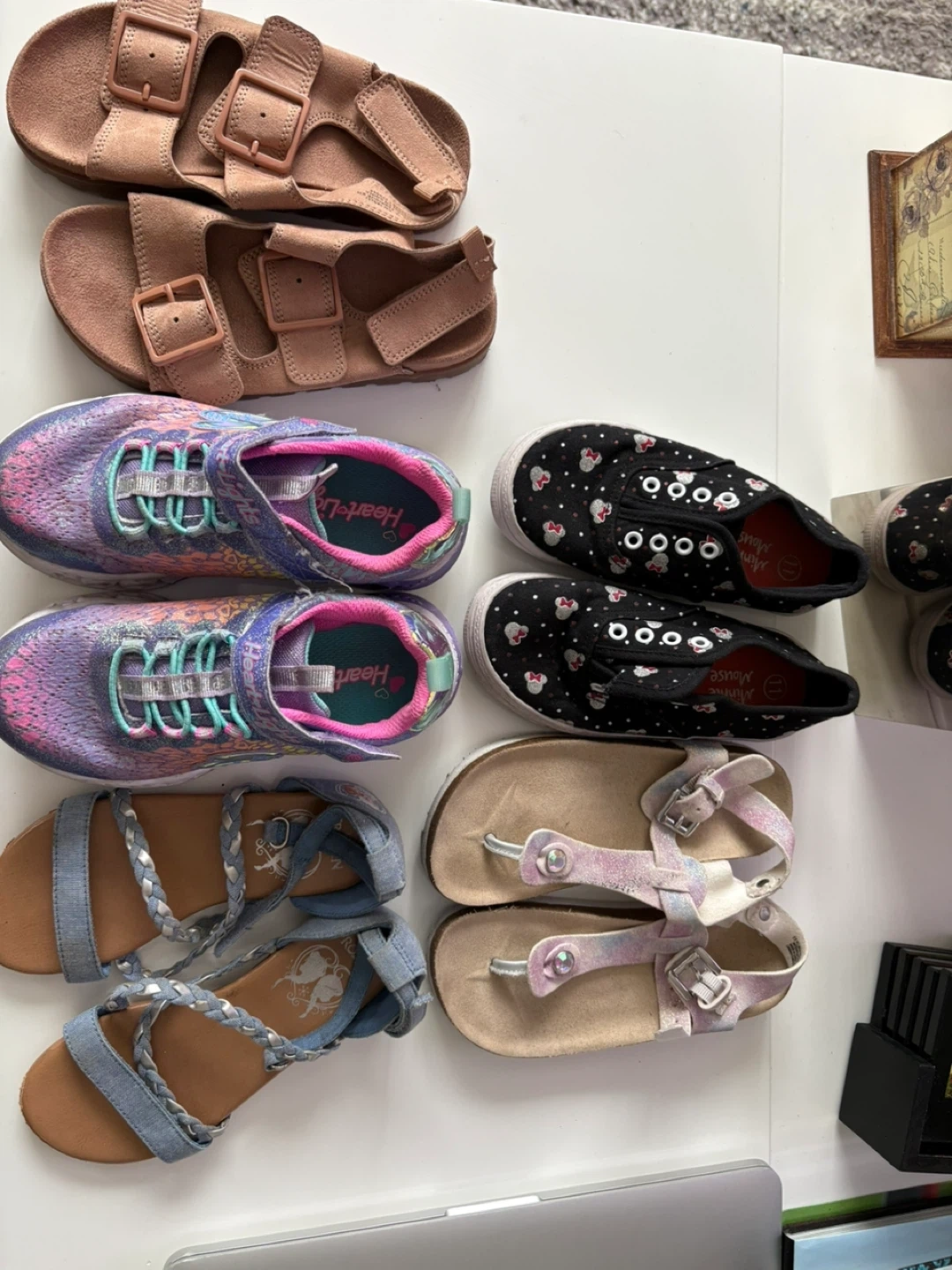 This bundle includes a variety of kids' shoes. There are two pairs of athletic shoes with HeartLght technology, two pairs of black Minnie Mouse slip-on sneakers, two pairs of tan/denim sandals, and two pairs of pink/white glitter sandals. These are great for everyday wear and different occasions!