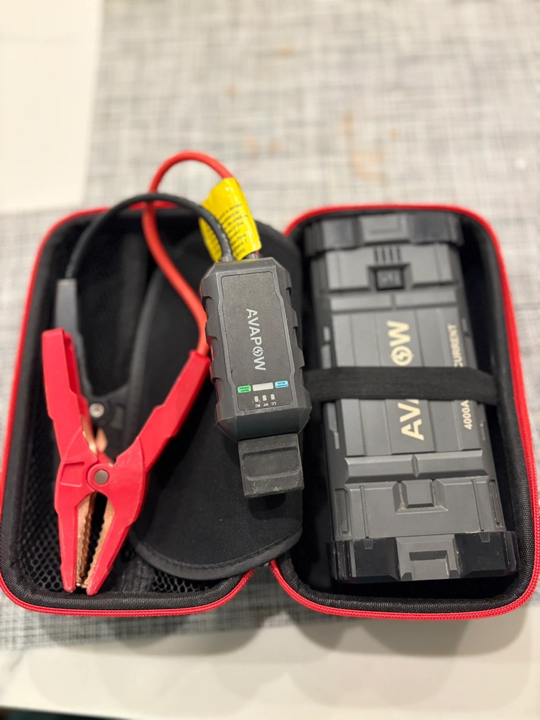 AVAPOW jump starter with 4000A peak current. Includes jumper cables and a protective carrying case. Features a battery indicator. This device helps start vehicles with a dead battery.