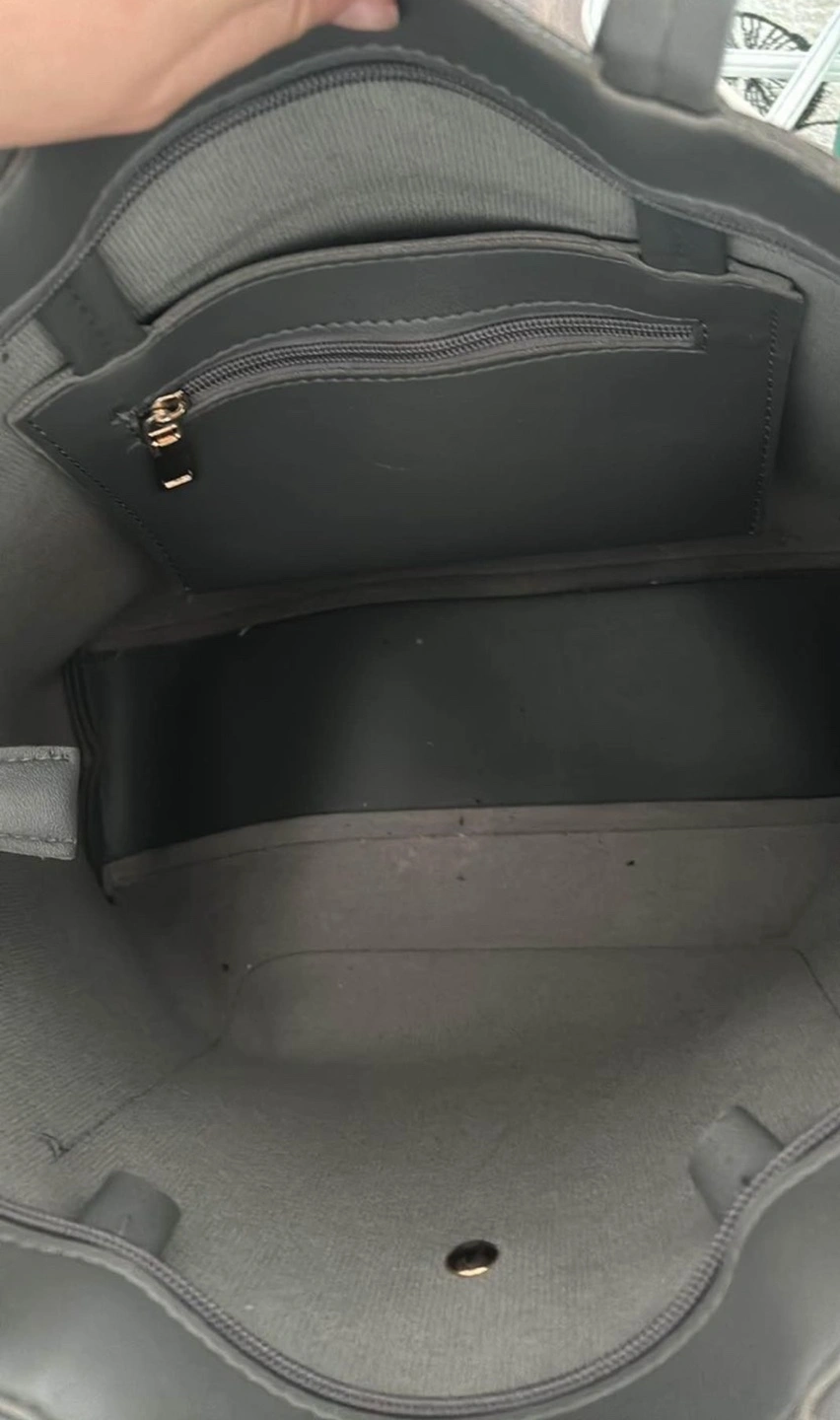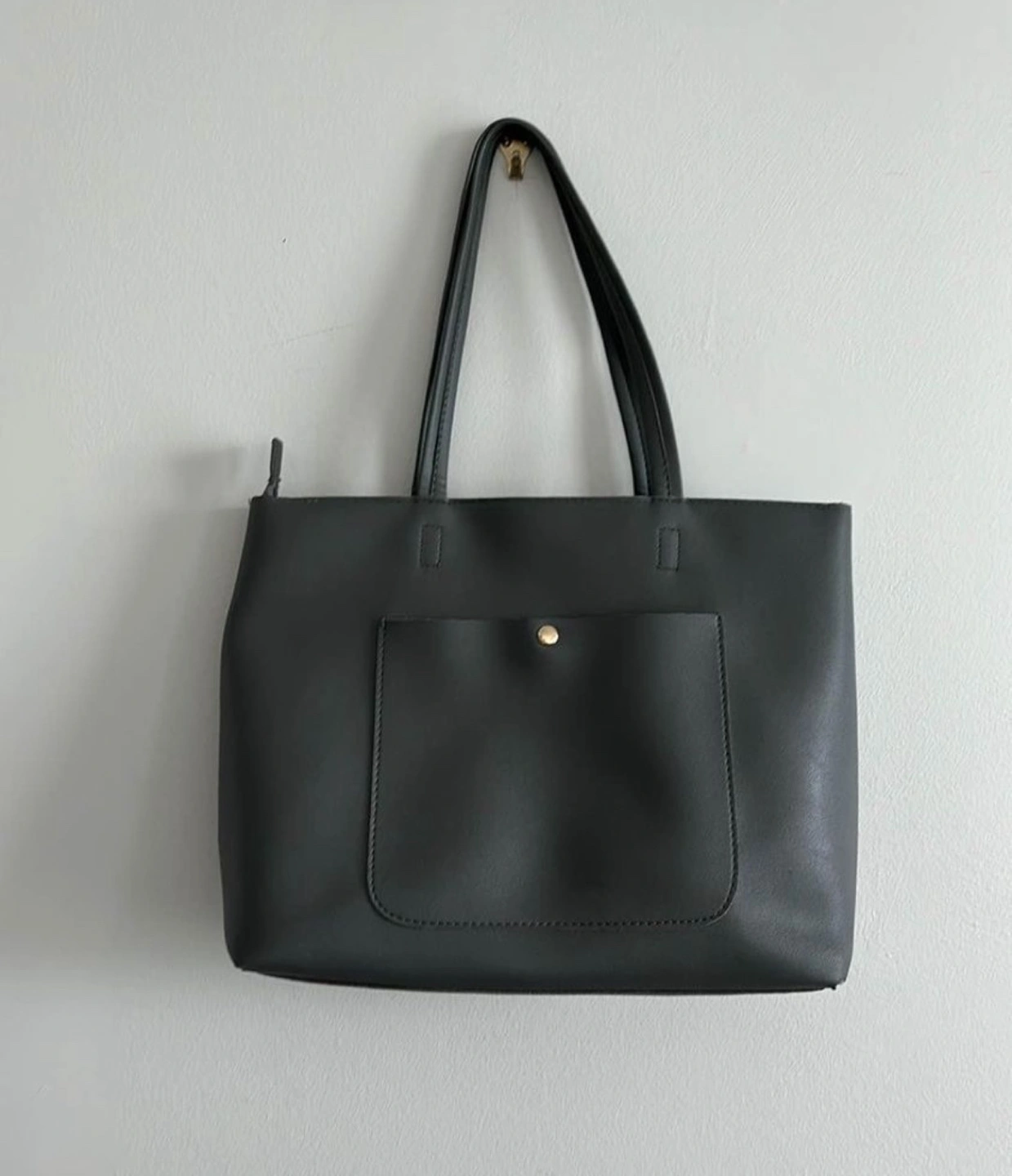 Large tote bag with zipper closure. Features a front pocket with button closure.