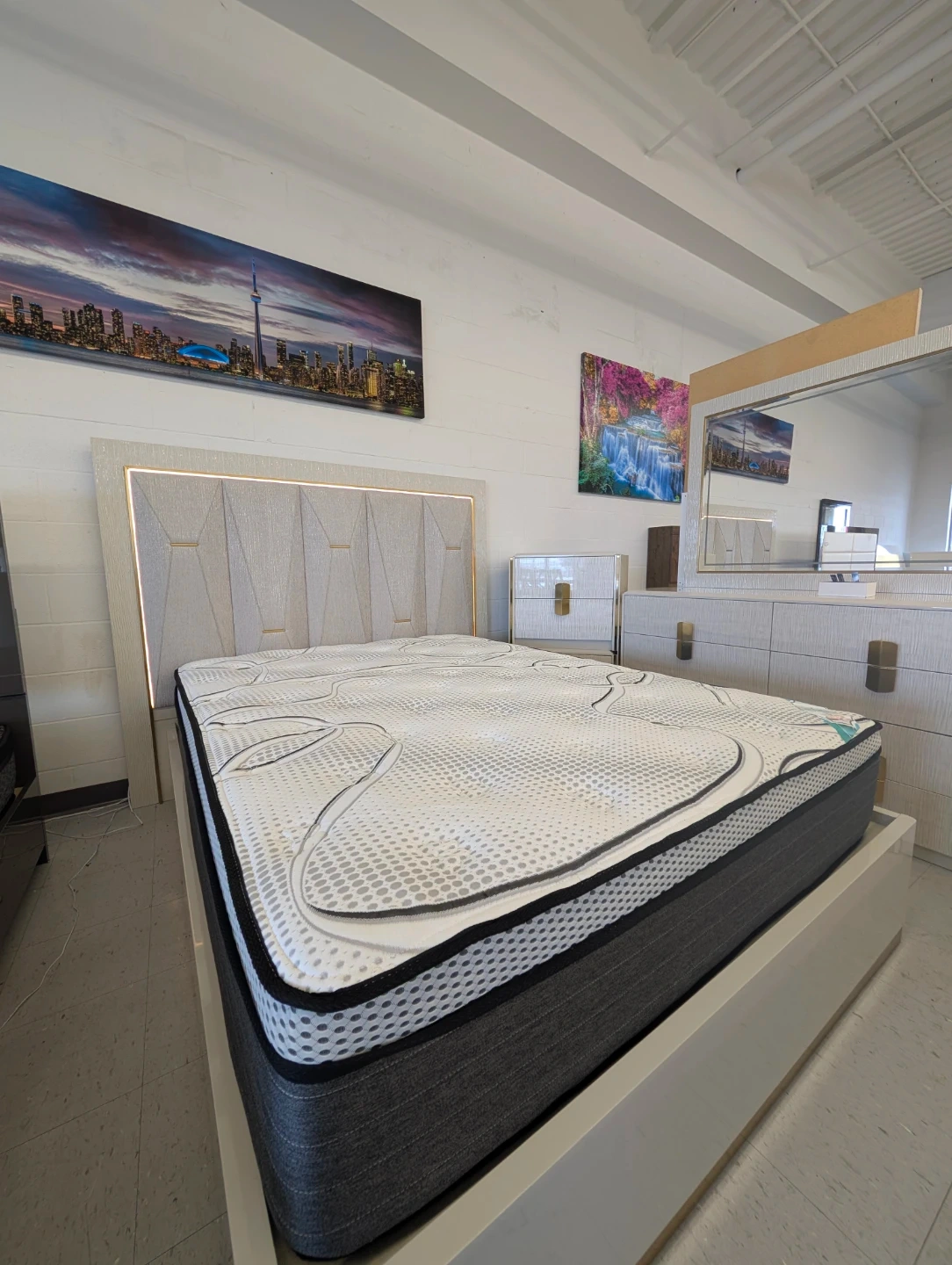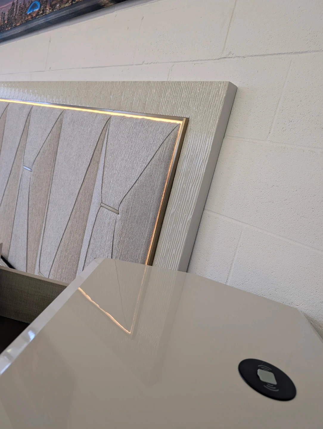 Stylish bed frame featuring a unique upholstered headboard with built-in LED lighting. It's designed with a modern aesthetic, perfect for updating any bedroom. This frame includes integrated nightstands with storage and charging slot.