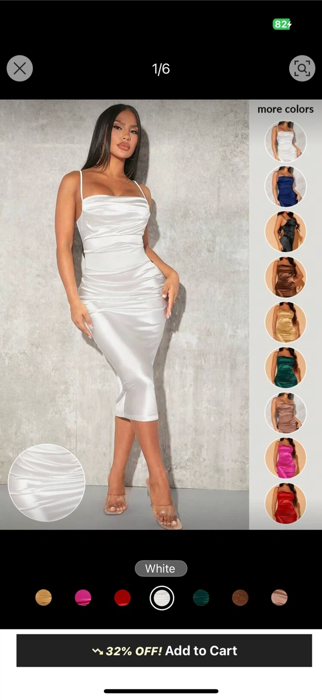 Sleek white satin midi dress with a cowl neckline and adjustable spaghetti straps. It's ruched on the side for a flattering fit. This dress is made of a polyester-spandex blend.