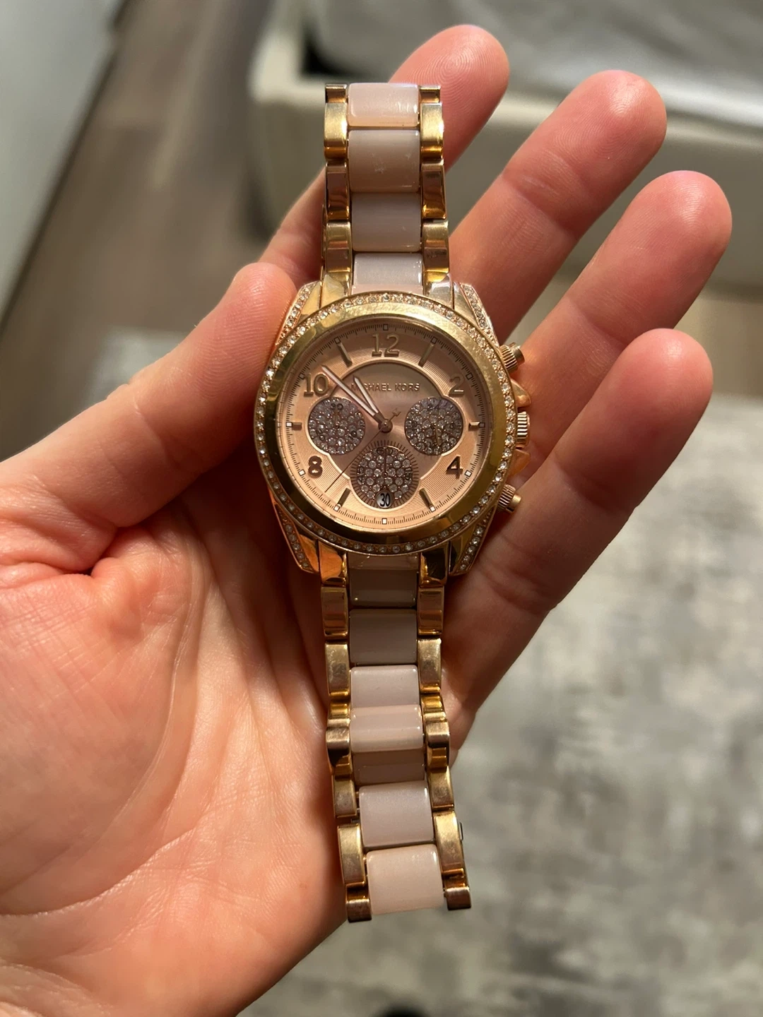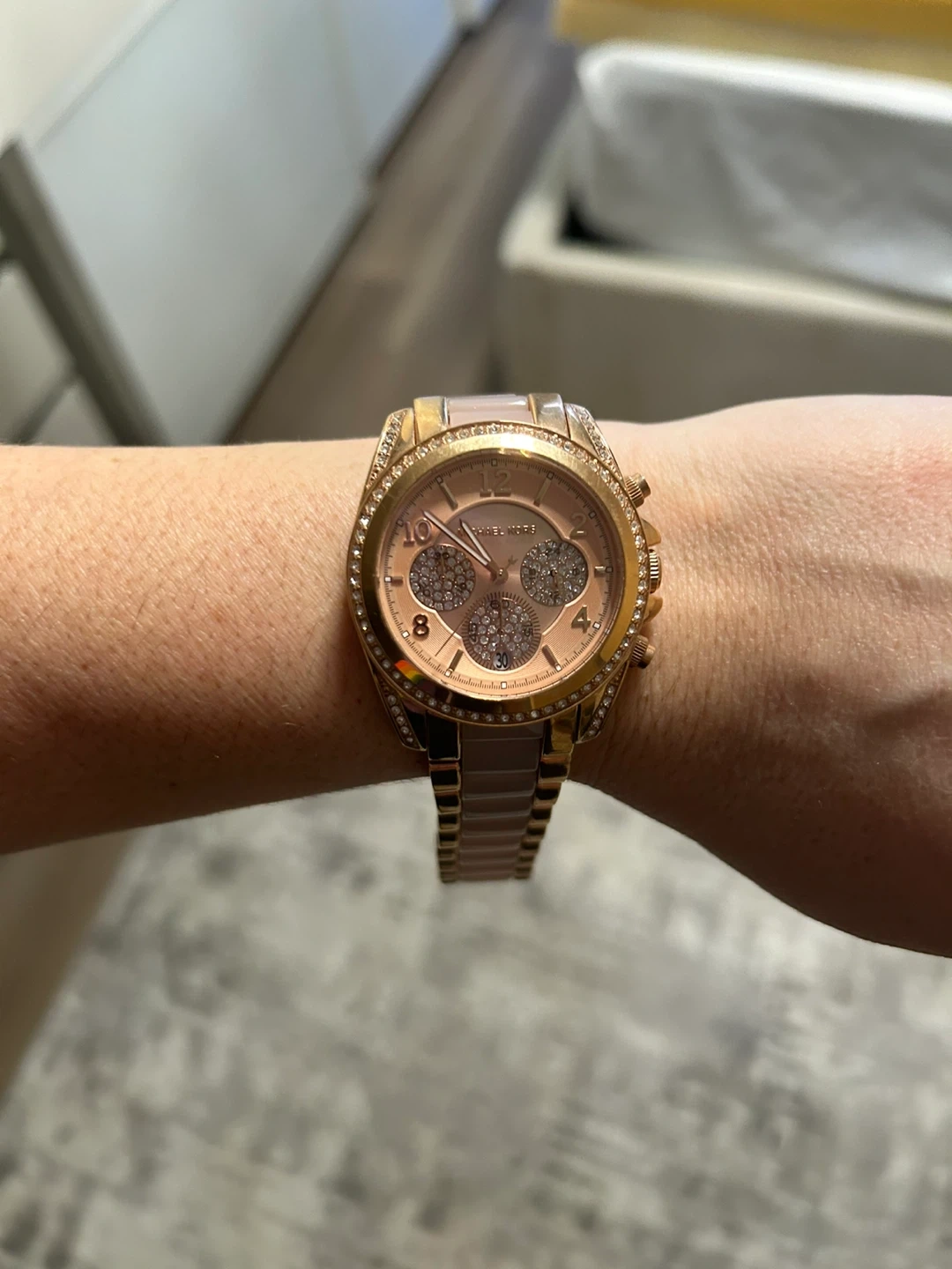 Michael Kors chronograph watch with a rose gold-tone stainless steel band and case. It features a pink dial with crystal accents and three subdials. This elegant timepiece is suitable for everyday wear or special occasions.