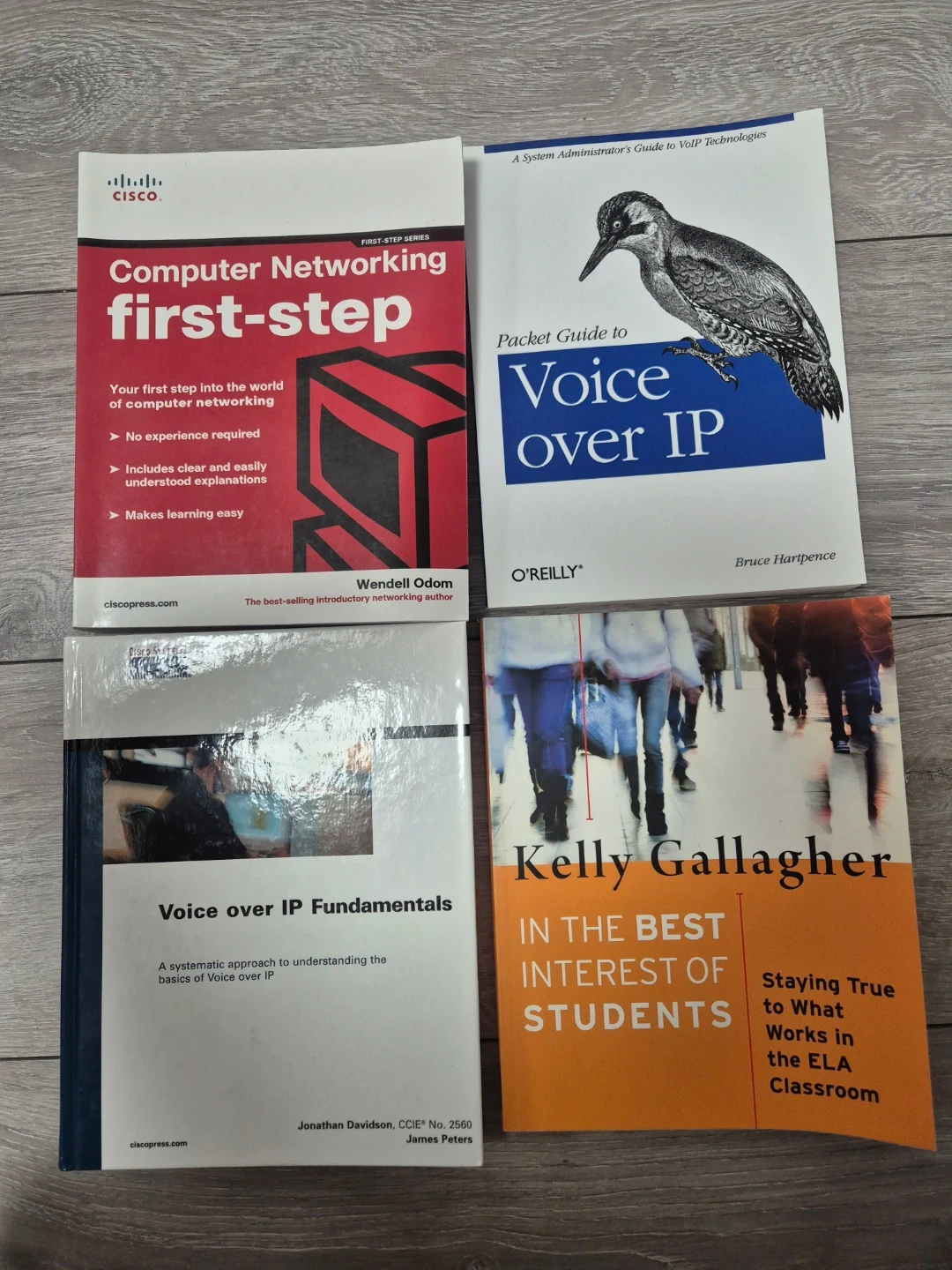 This lot includes 'Computer Networking first-step' by Wendell Odom, 'Packet Guide to Voice over IP' by Bruce Hartpence, and 'Voice over IP Fundamentals' by Jonathan Davidson & James Peters. Also included is 'In the Best Interest of Students' by Kelly Gallagher.