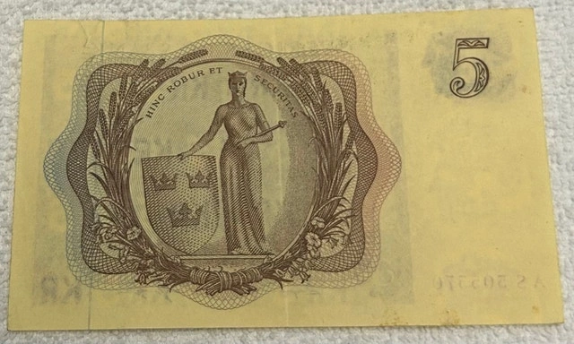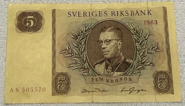 I'm offering a Swedish 5 Kronor banknote from 1963. It is in good condition for its age, showing signs of circulation. A tangible piece of Sweden's past! If the ad is up, it's available! Cash accepted, Cashless payment.