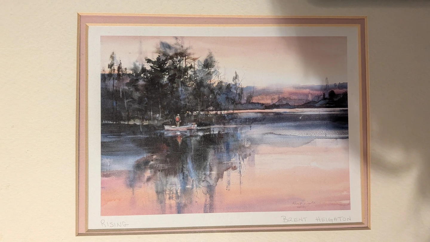 This is a framed small print titled "Rising" by artist Brent Highton. It depicts a serene lake scene with trees and reflections at sunrise or sunset. The artwork is housed in a gold-coloured frame.