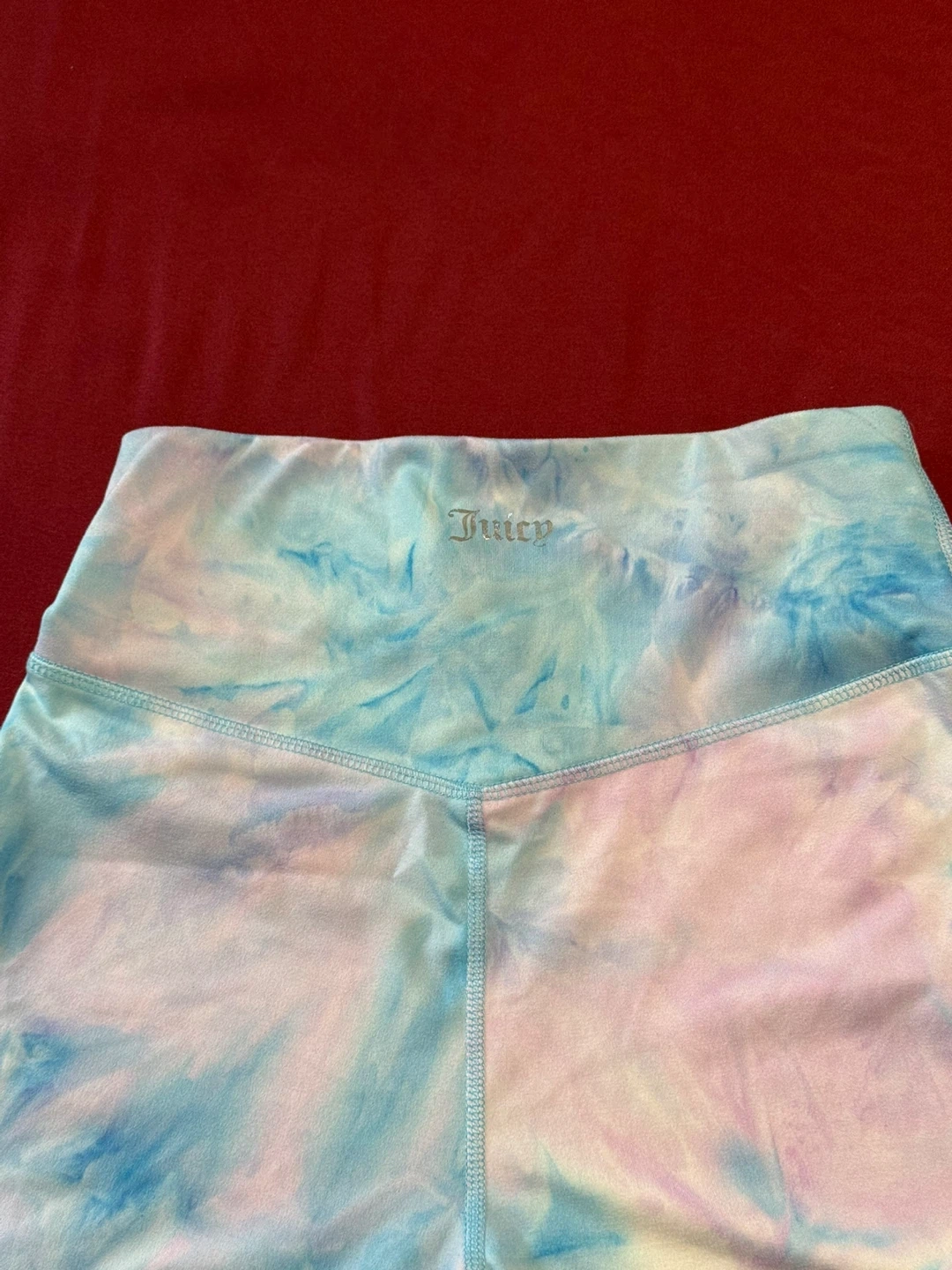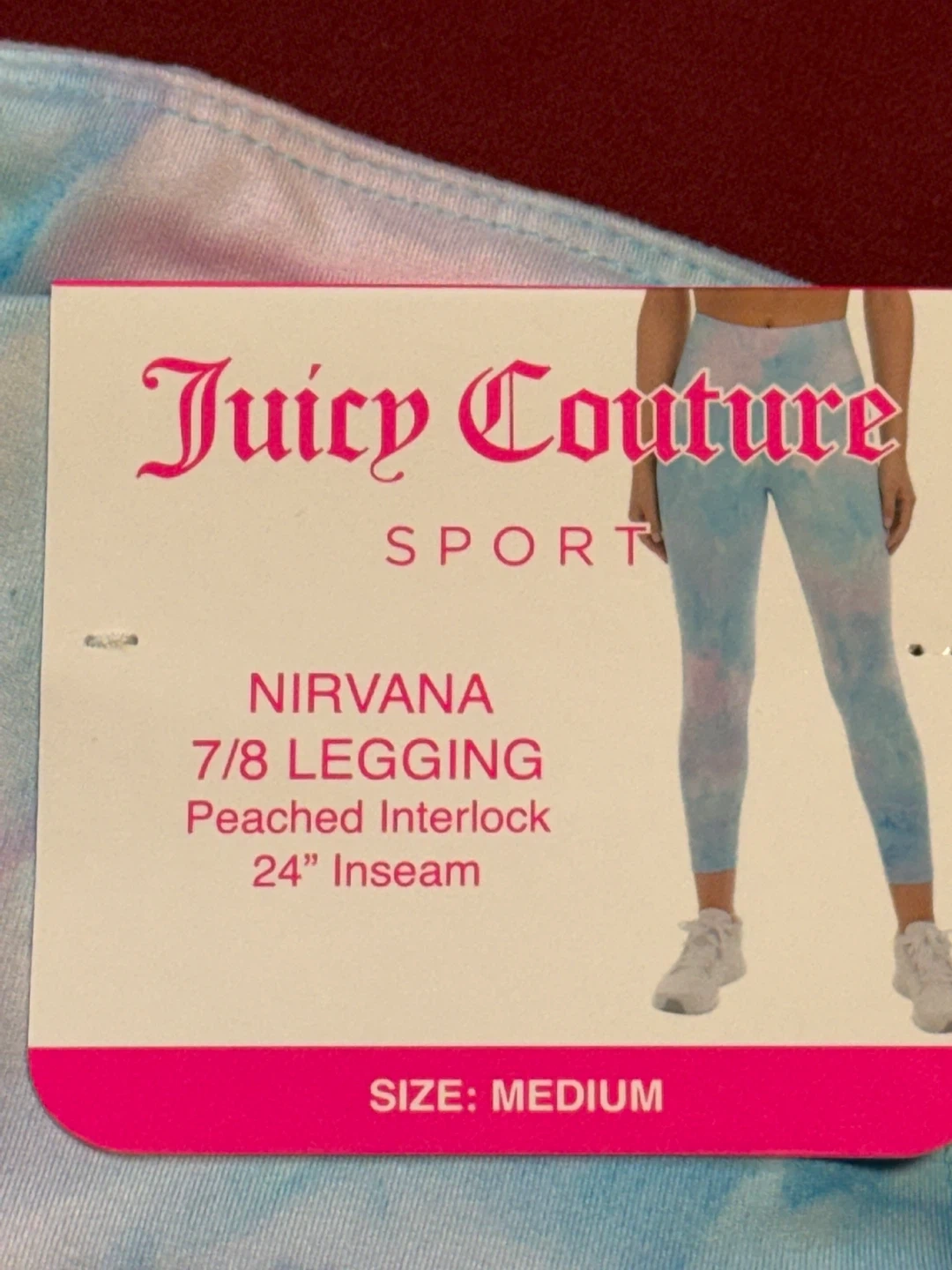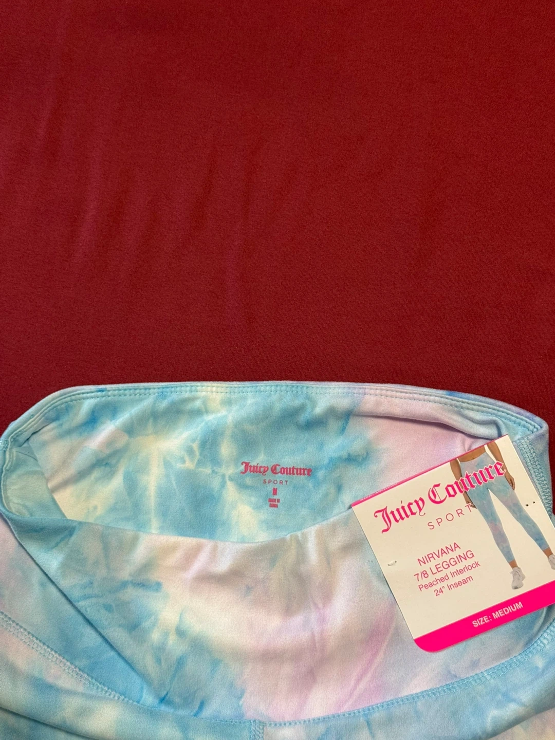 These Juicy Couture Sport Nirvana leggings are a size medium. They feature a peached interlock fabric and a 24" inseam. These 7/8 length leggings have a fun tie-dye pattern.