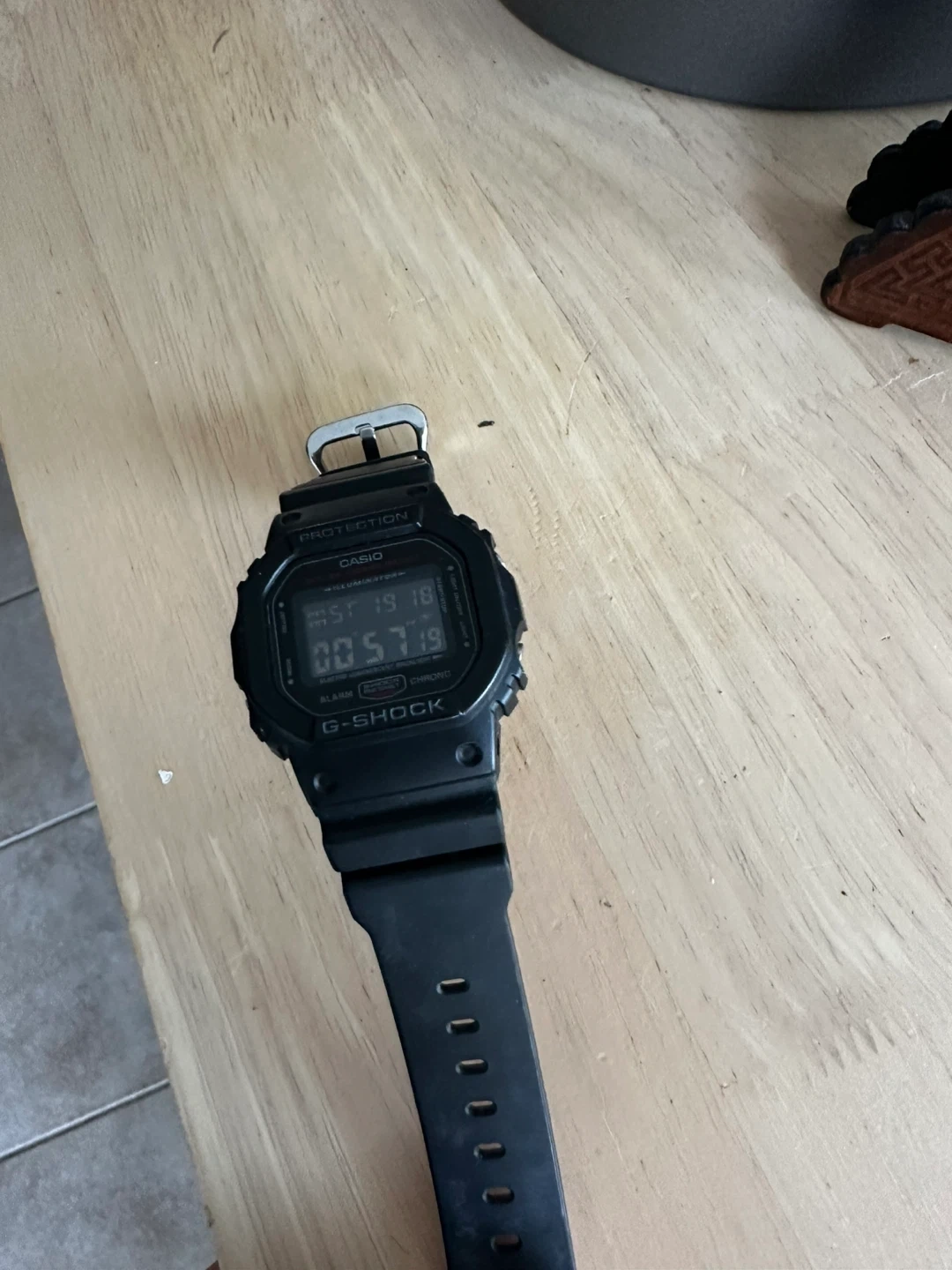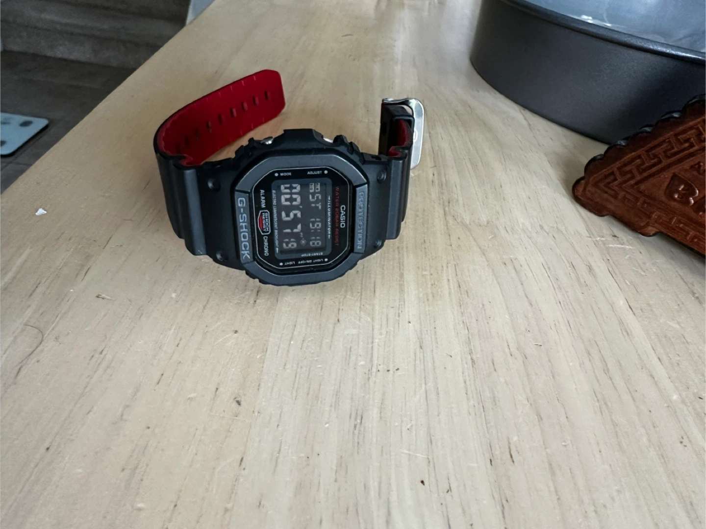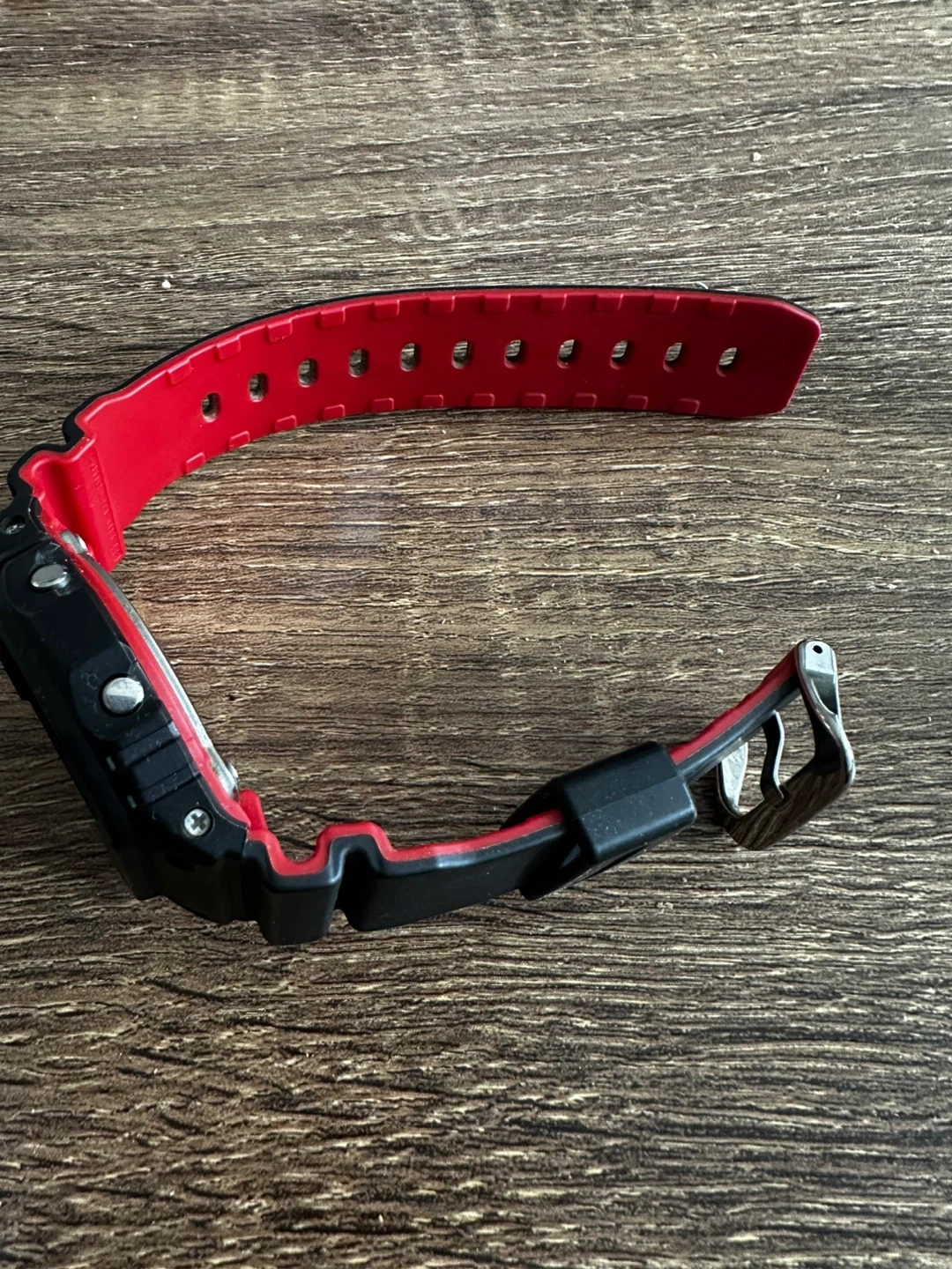 A black and red G-Shock DW-5600HR watch. It's shock resistant and water resistant up to 200 meters. This watch is great for everyday wear or for more rugged activities!