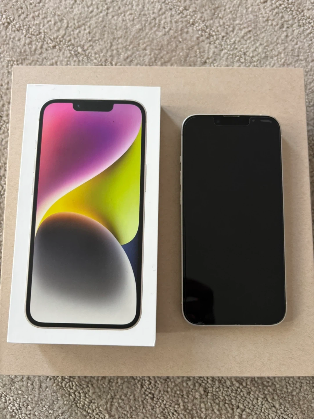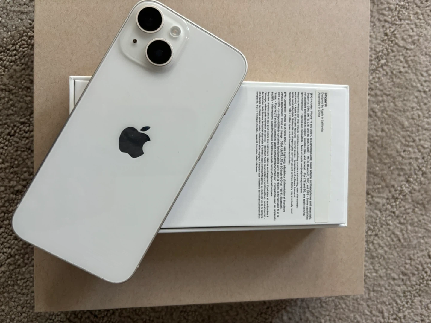 White iPhone 14 with original box. Features a 6.1-inch display. It's a great phone for everyday use! Very good condition. 128 GB unlocks.