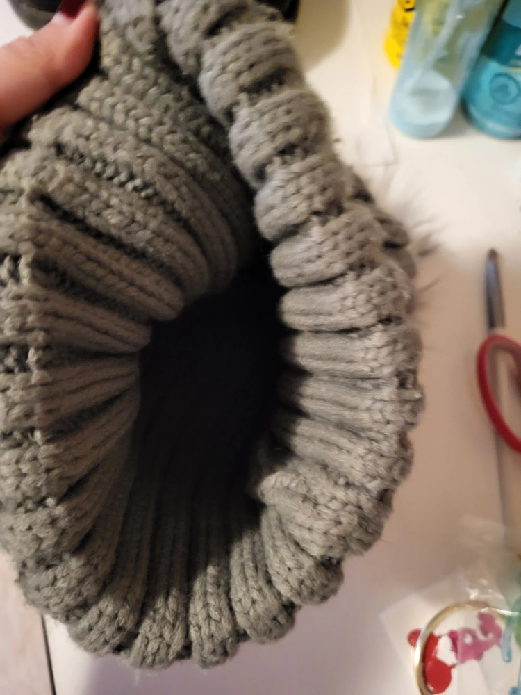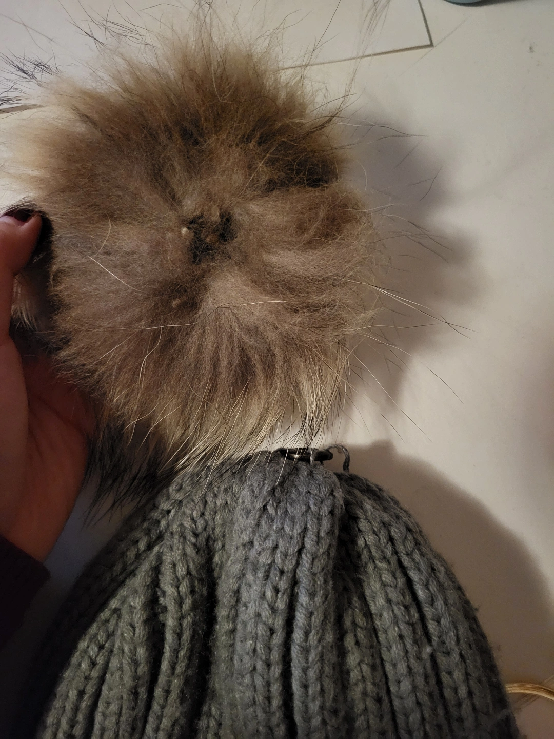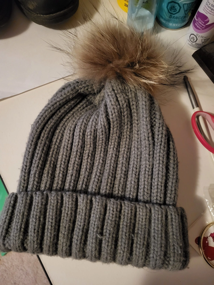 Grey knit beanie with a faux fur pom pom. The beanie is a ribbed knit and the pom pom is detachable. The beanie is in great condition.