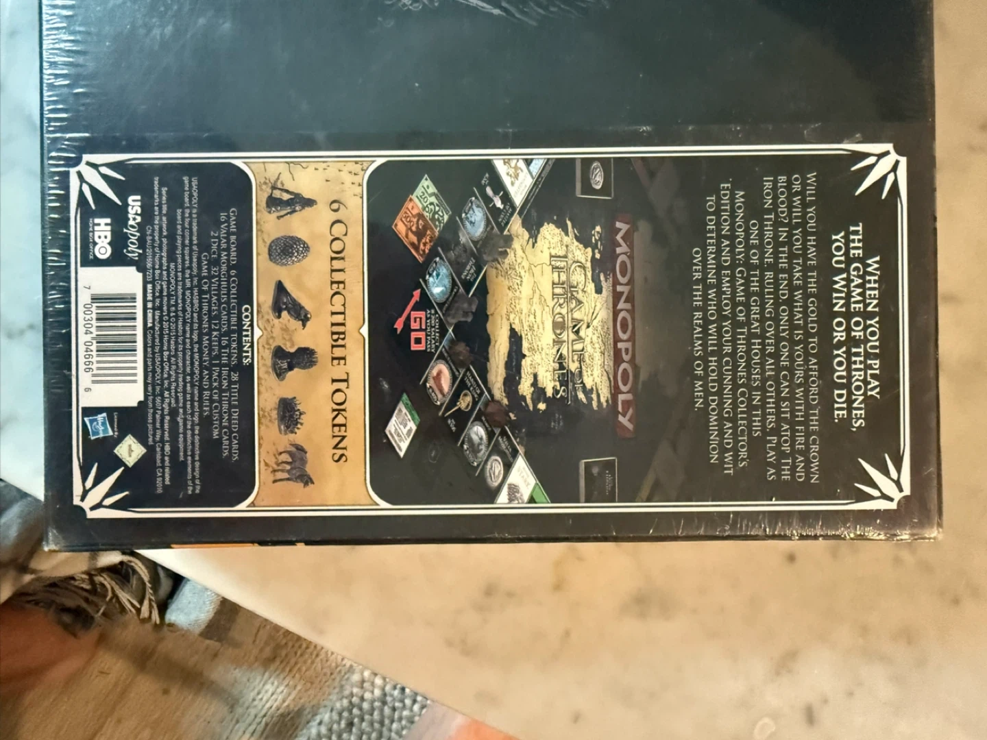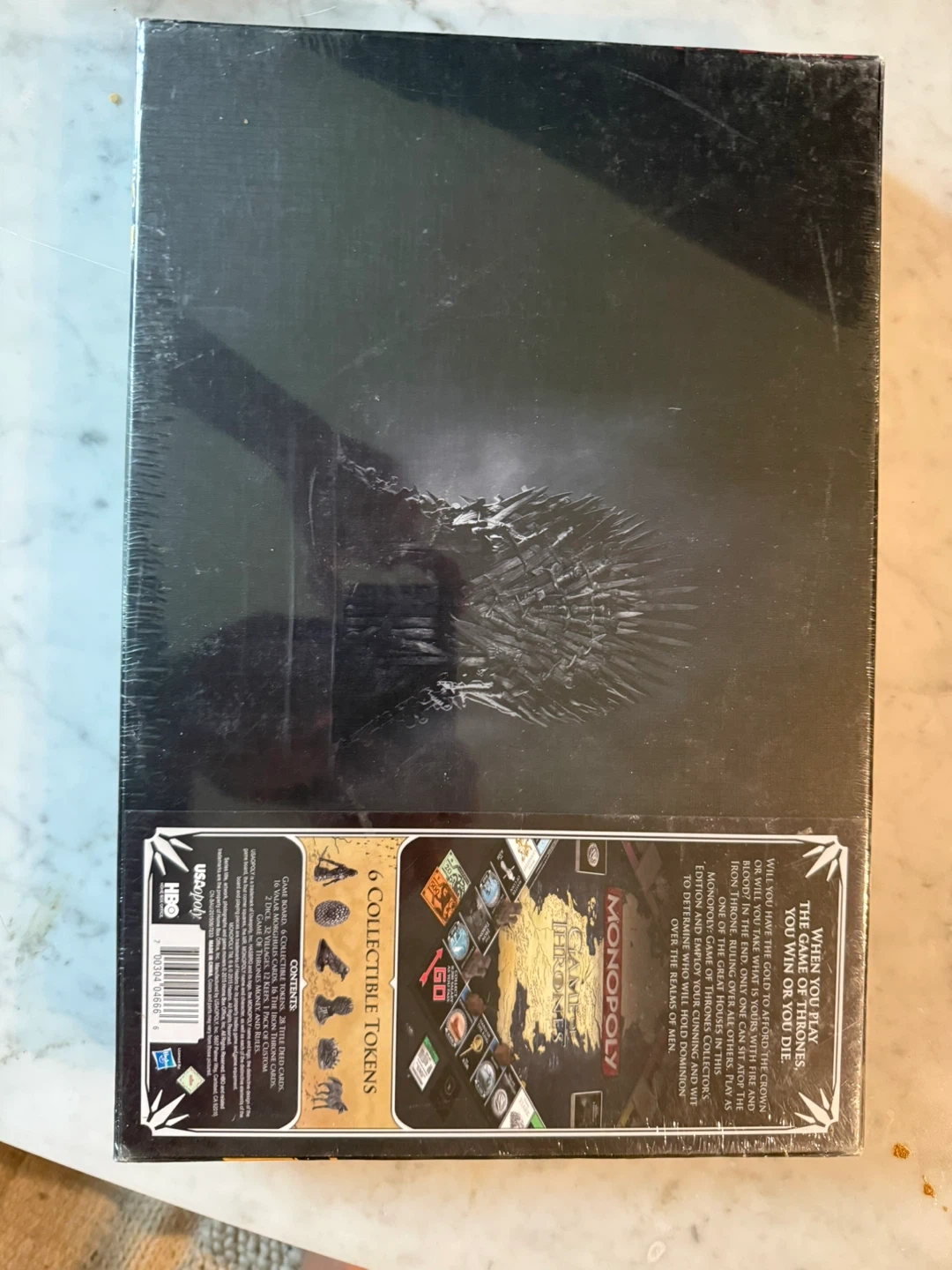 This is the Monopoly Game of Thrones Collector's Edition board game. It includes 6 collectible tokens, game board, 28 title deed cards, and 32 custom cards. Fun for Game of Thrones fans!