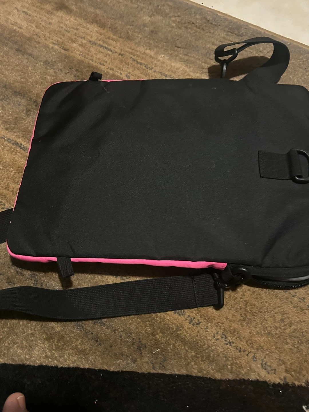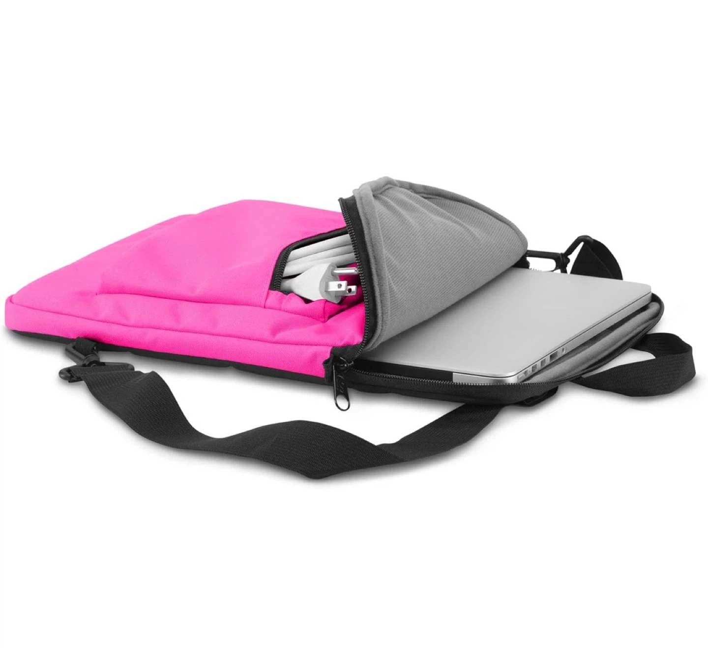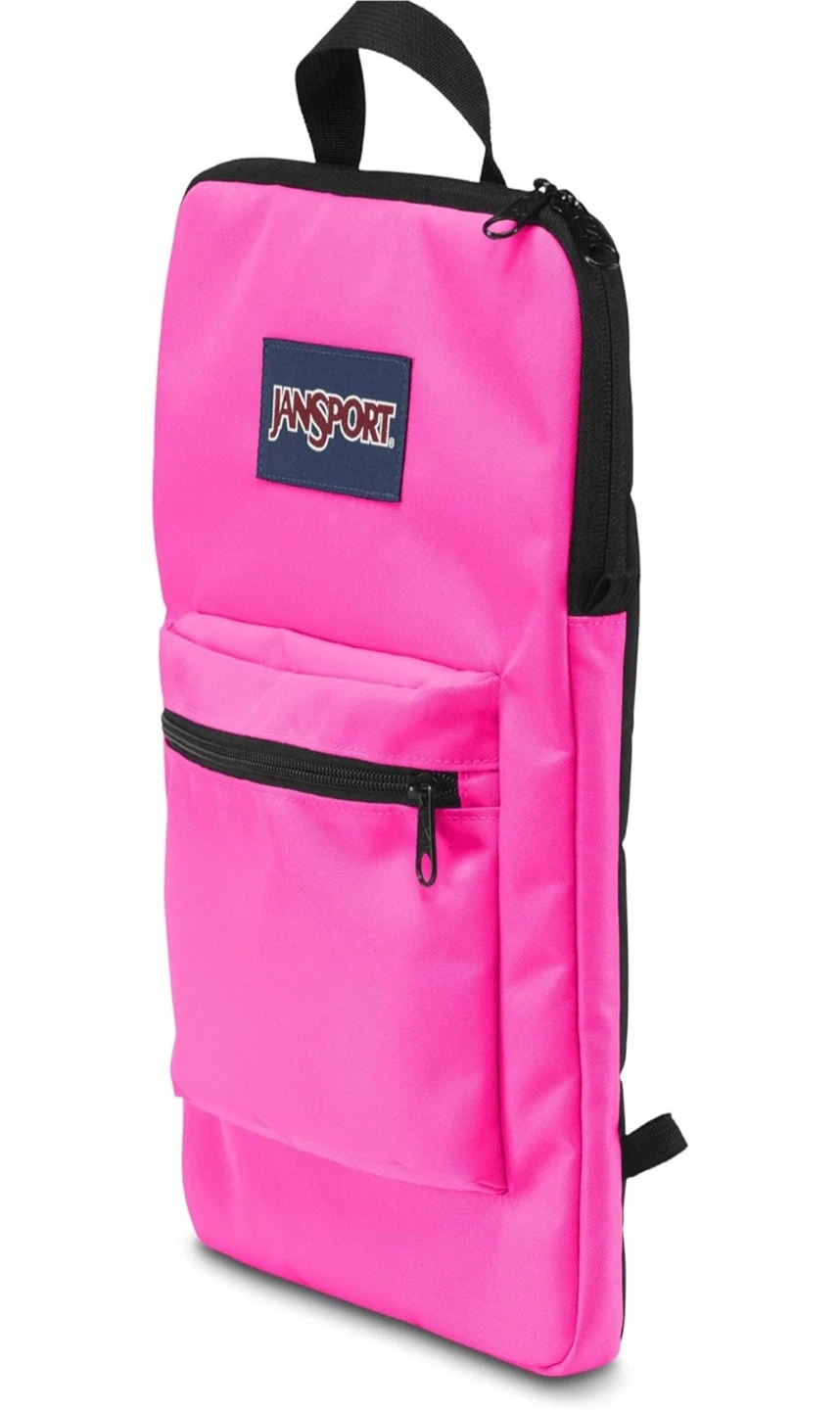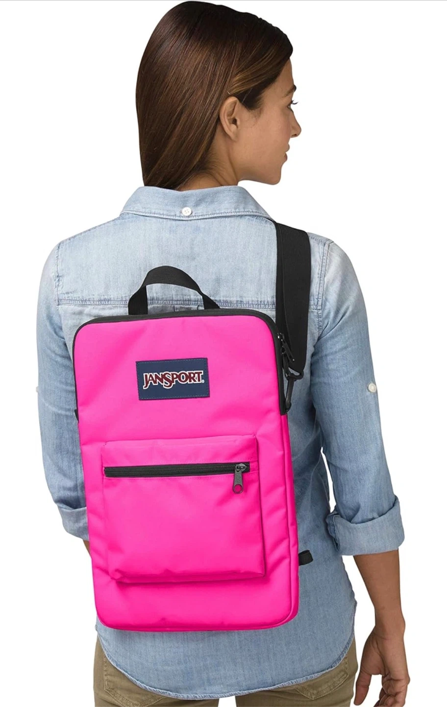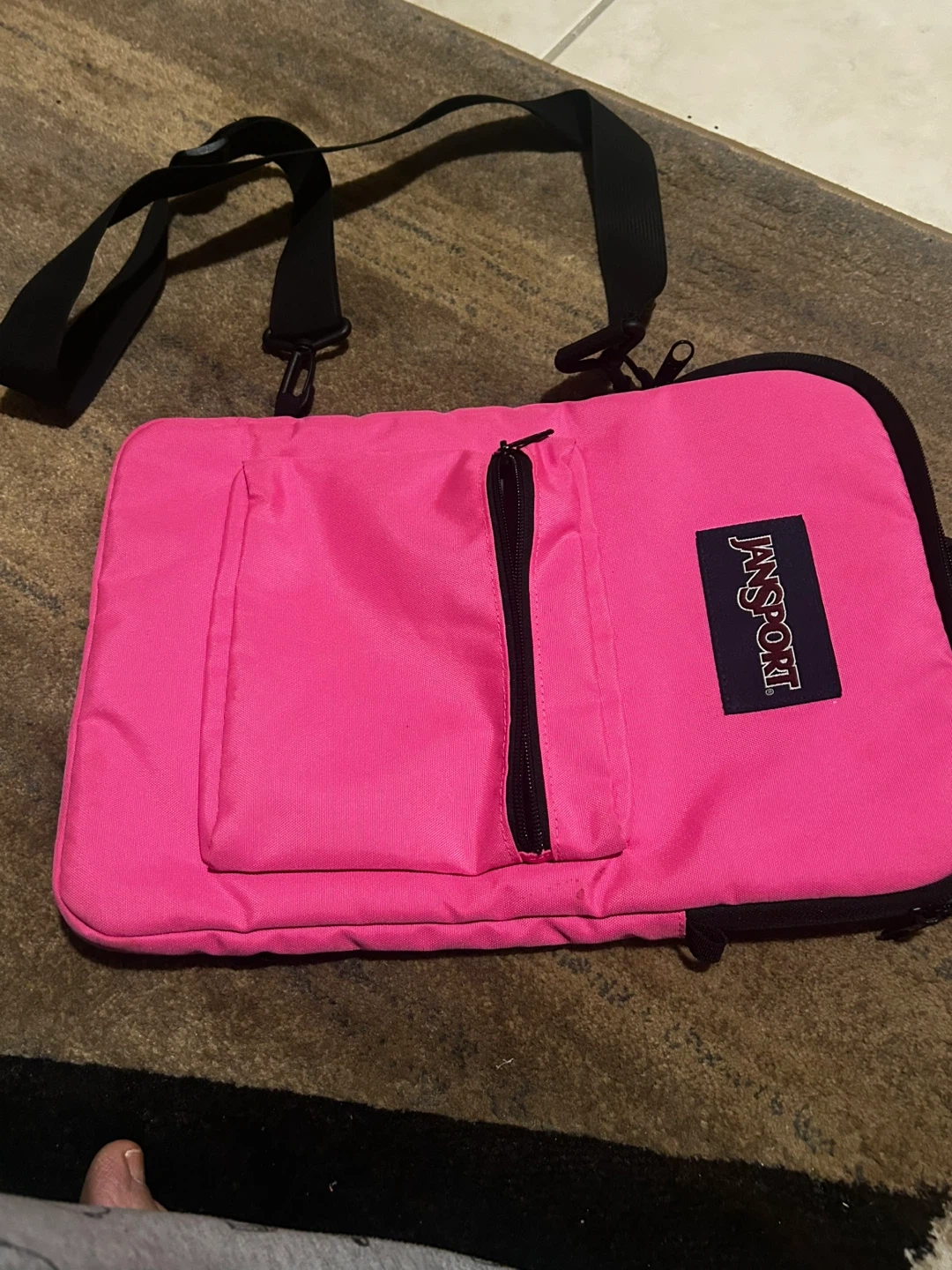 This is a Jansport messenger bag in a bright pink colour. It has a main zippered compartment and a front zippered pocket. The interior is padded with grey fabric, and it comes with an adjustable shoulder strap.