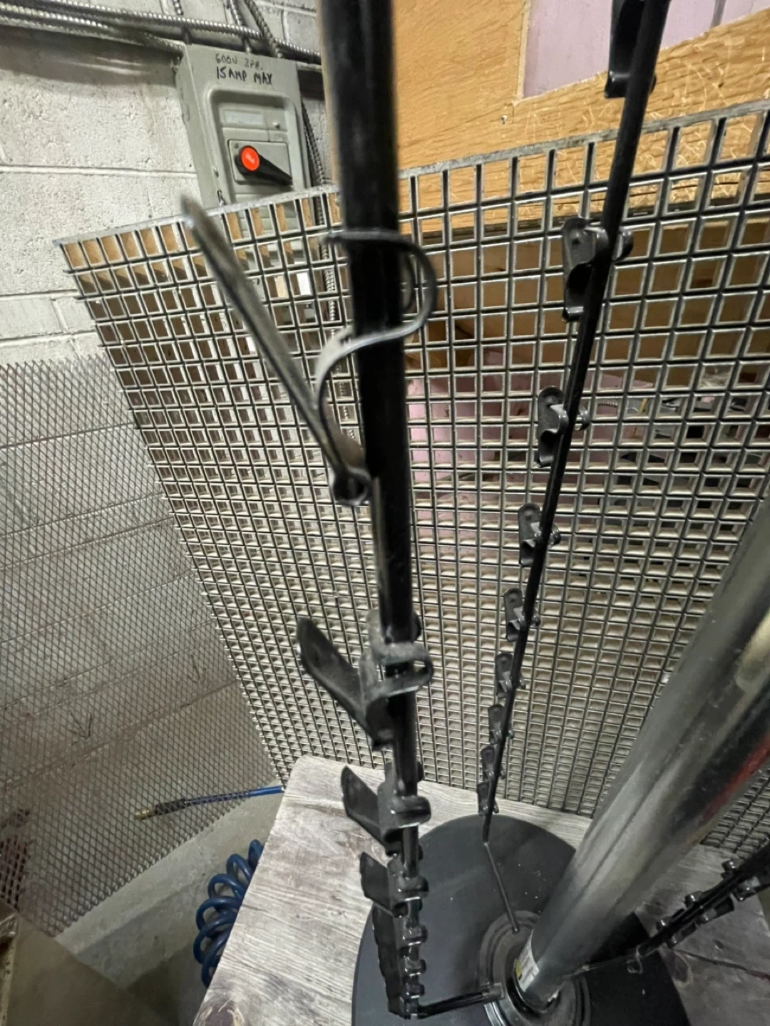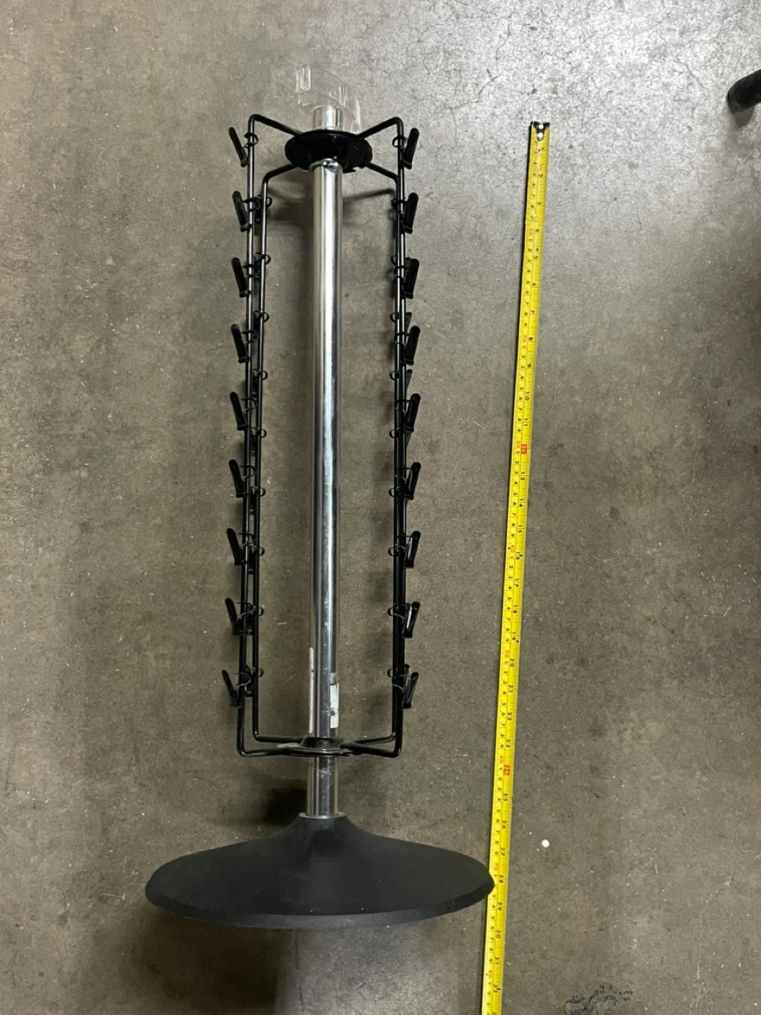 This is a rotating display stand, perfect for showcasing eyewear or other small retail items. It features a chrome pole with multiple tiers of clips for hanging merchandise. The black base provides stability. This stand is great for retail environments or trade shows!