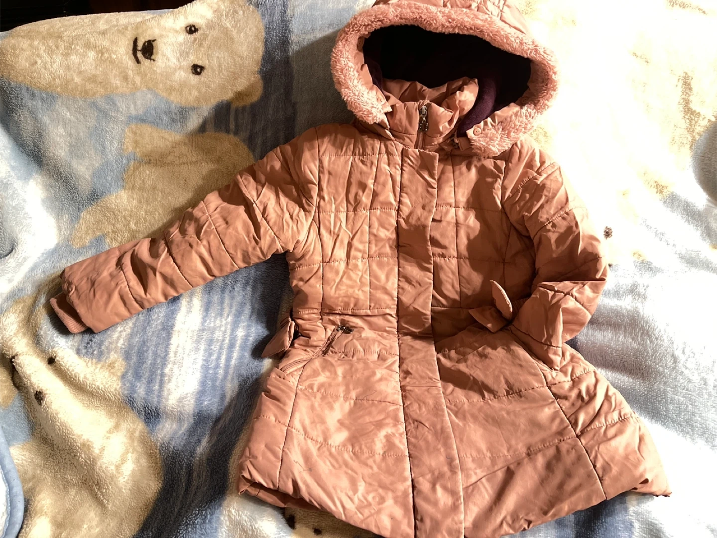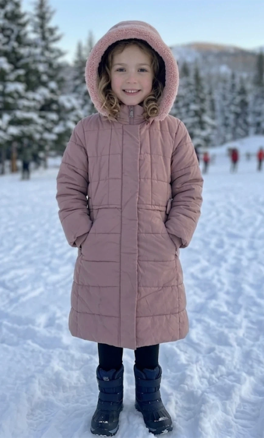 A stylish pink quilted winter coat designed for warmth and comfort. It features a cozy fur-lined hood and a belted waist for a flattering fit. This coat is perfect for keeping kids snug during colder months.