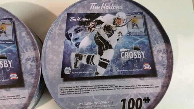 Tim Hortons Sidney Crosby NHL Penguins 100 Piece Puzzle Tin Box (2009) COMPLETE. Up for sale we have 3 x Sidney Crosby 100 piece Puzzle. Save as collector item or use it. Give as gift. Each tin can are 7 1/2 x 2 3/4. One Puzzle is missing one piece as shown in photo. ALL IN GREAT CONDITION. ASKING $20 FOR ALL 3