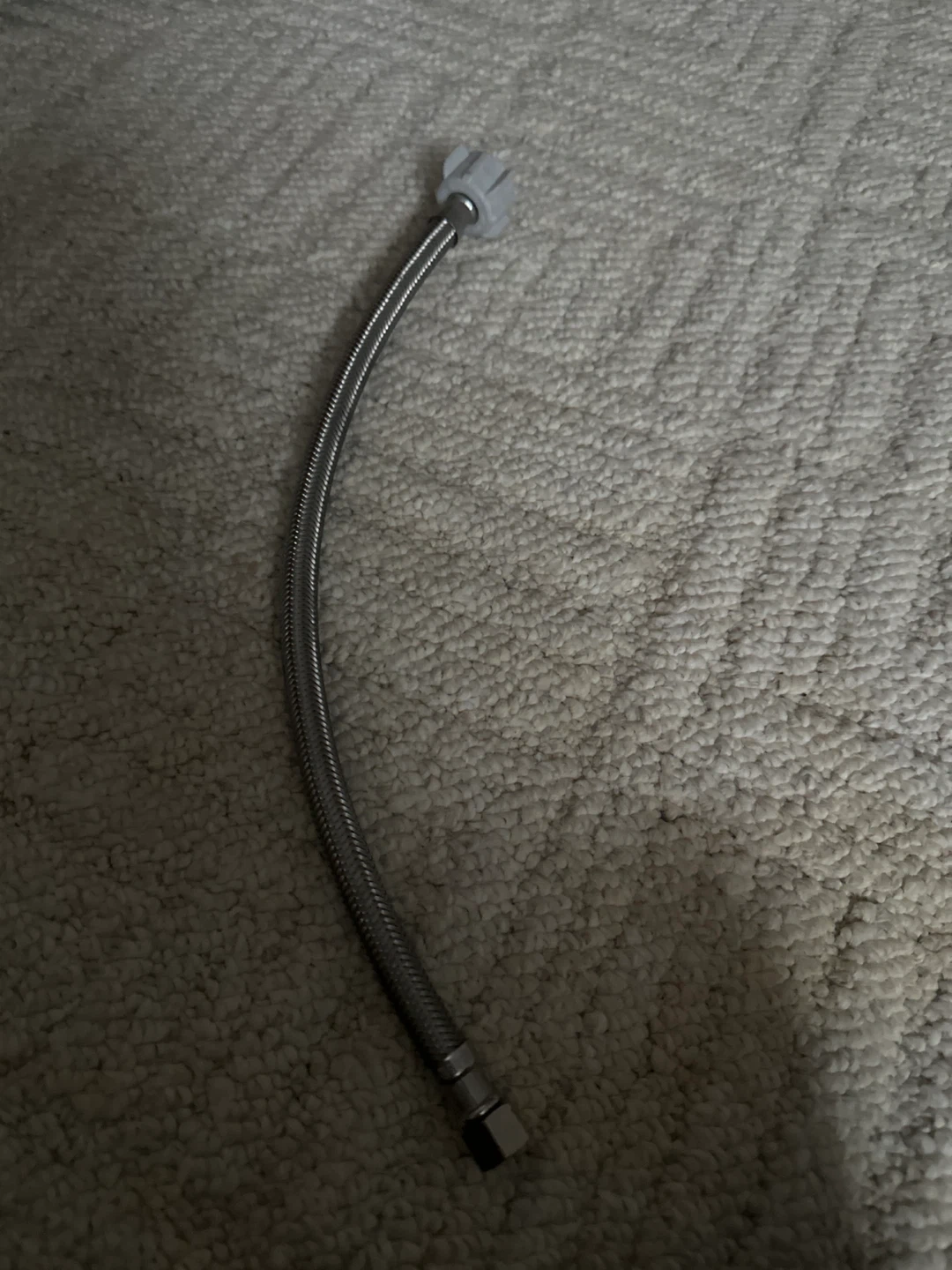 Braided stainless steel flexible water supply line. It has a durable braided exterior and metal fittings for a secure connection. Measures approximately 16 inches long.