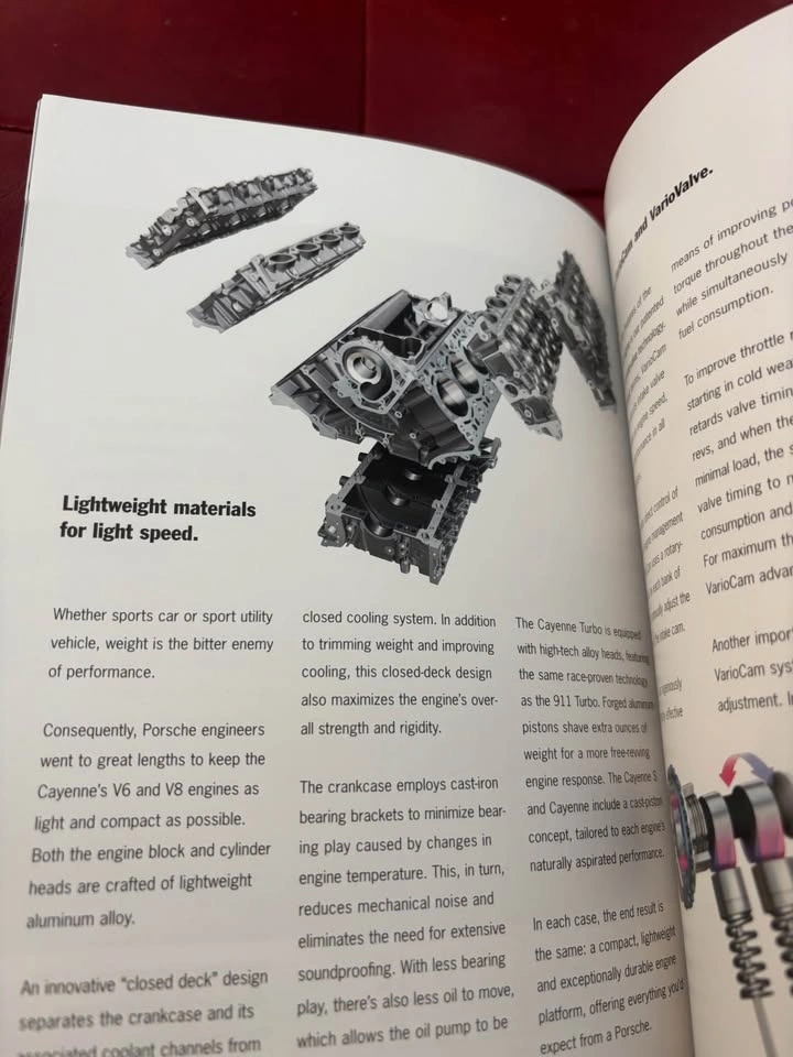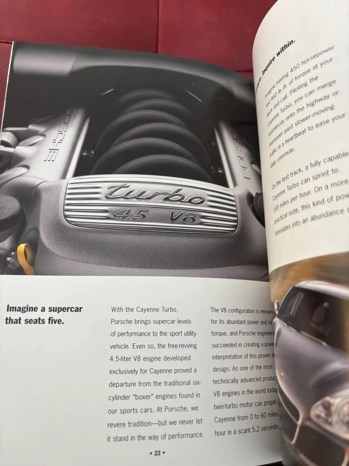 Original Porsche Cayenne marketing material covering all engines and models. Includes 2004 interior/exterior colors and a breakdown of various components. A must for a Porsche enthusiast or owner.