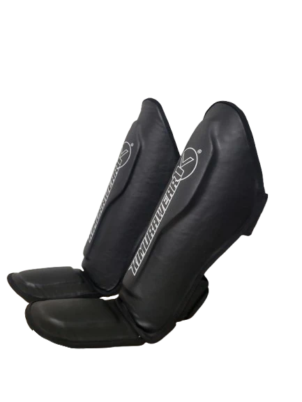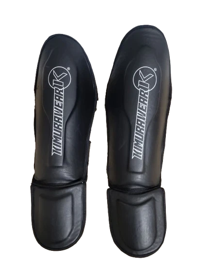 A pair of black Kimurawear shin guards. They're made for martial arts training. Offers great protection.