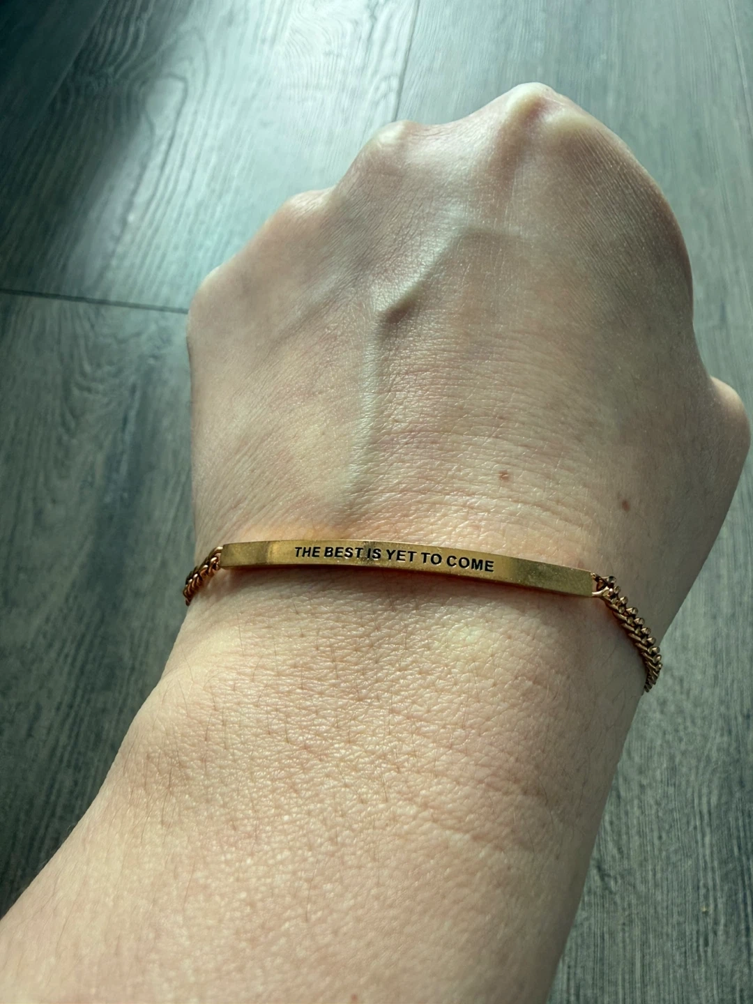 This rose gold tone bracelet from Inspiration Co. features the engraved phrase "The Best Is Yet To Come".