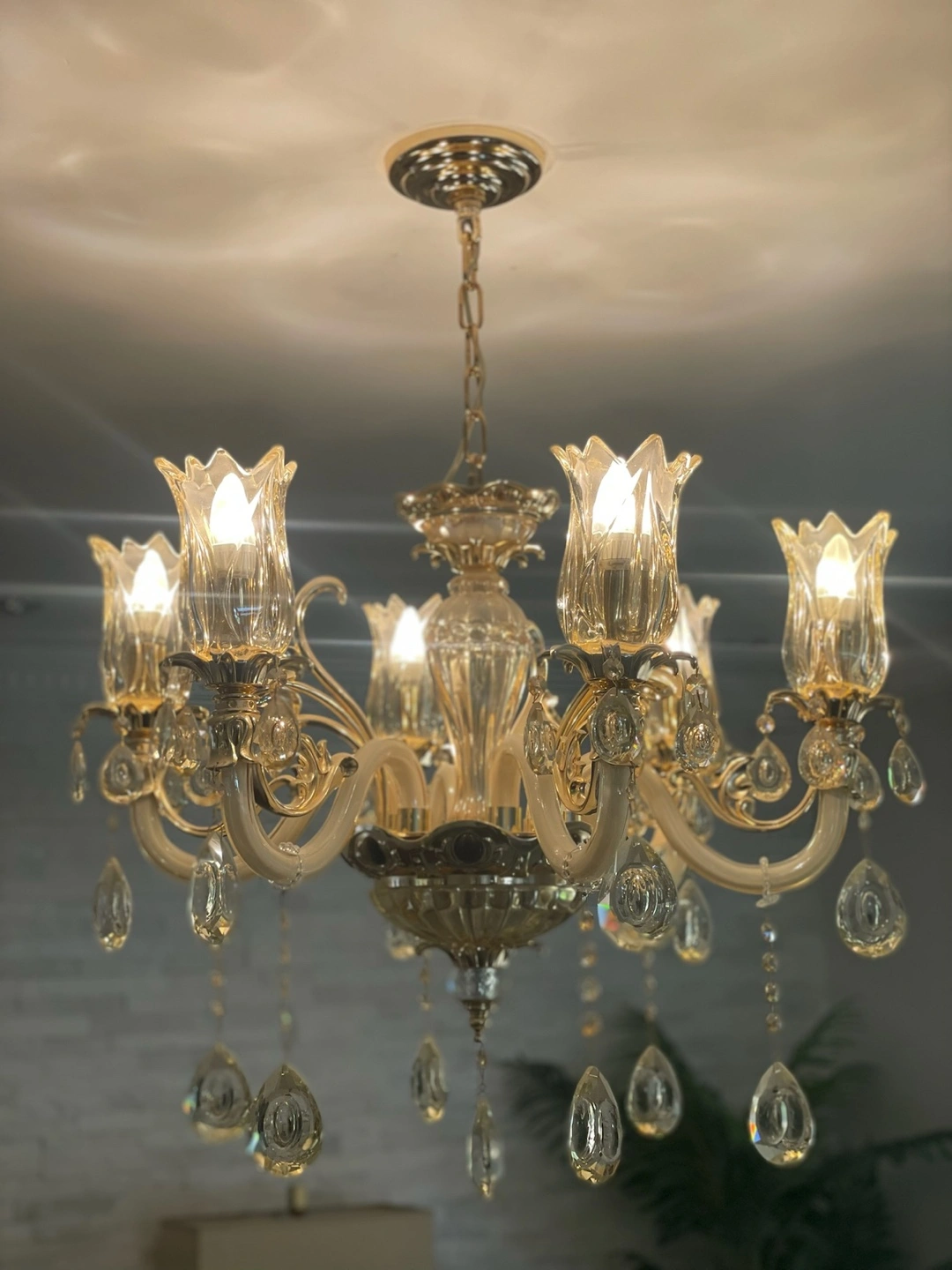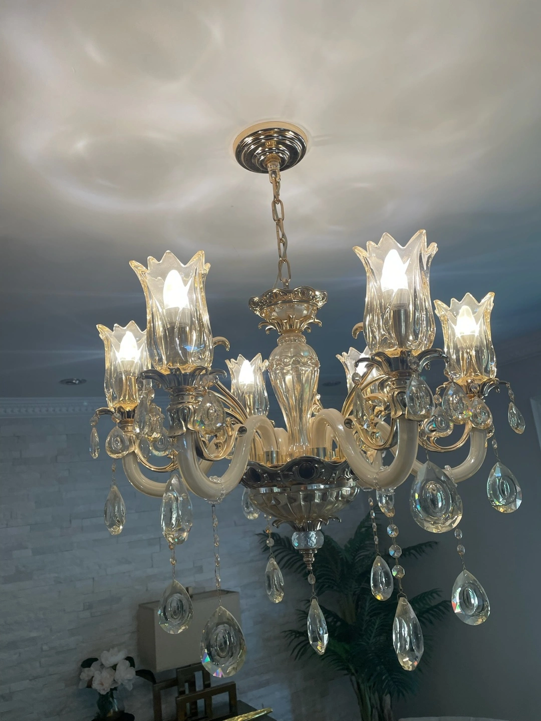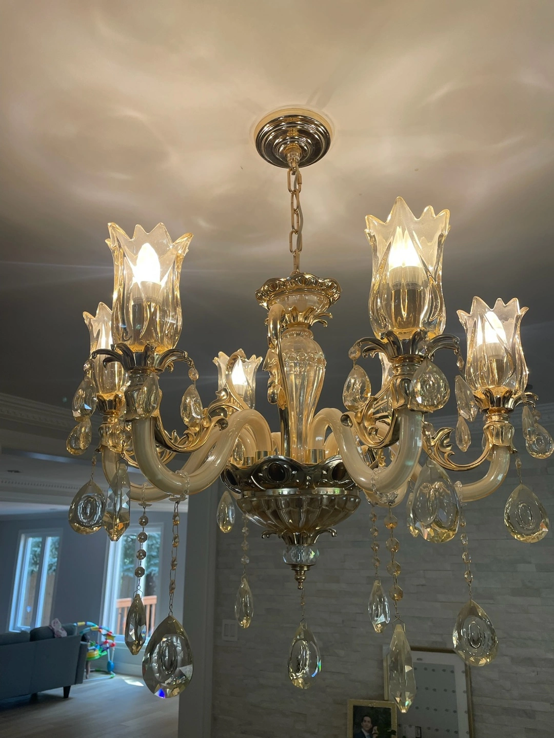 Beautiful 6-light chandelier. Features crystal accents and a gold finish. Adds a touch of elegance to any room. Perfect for dining room or living room.