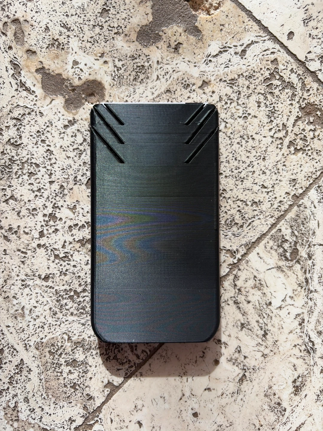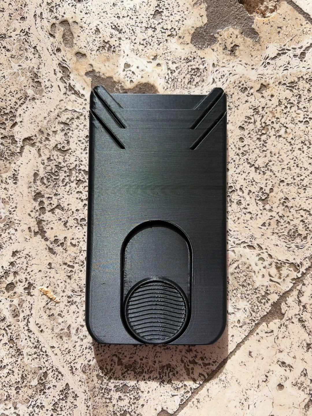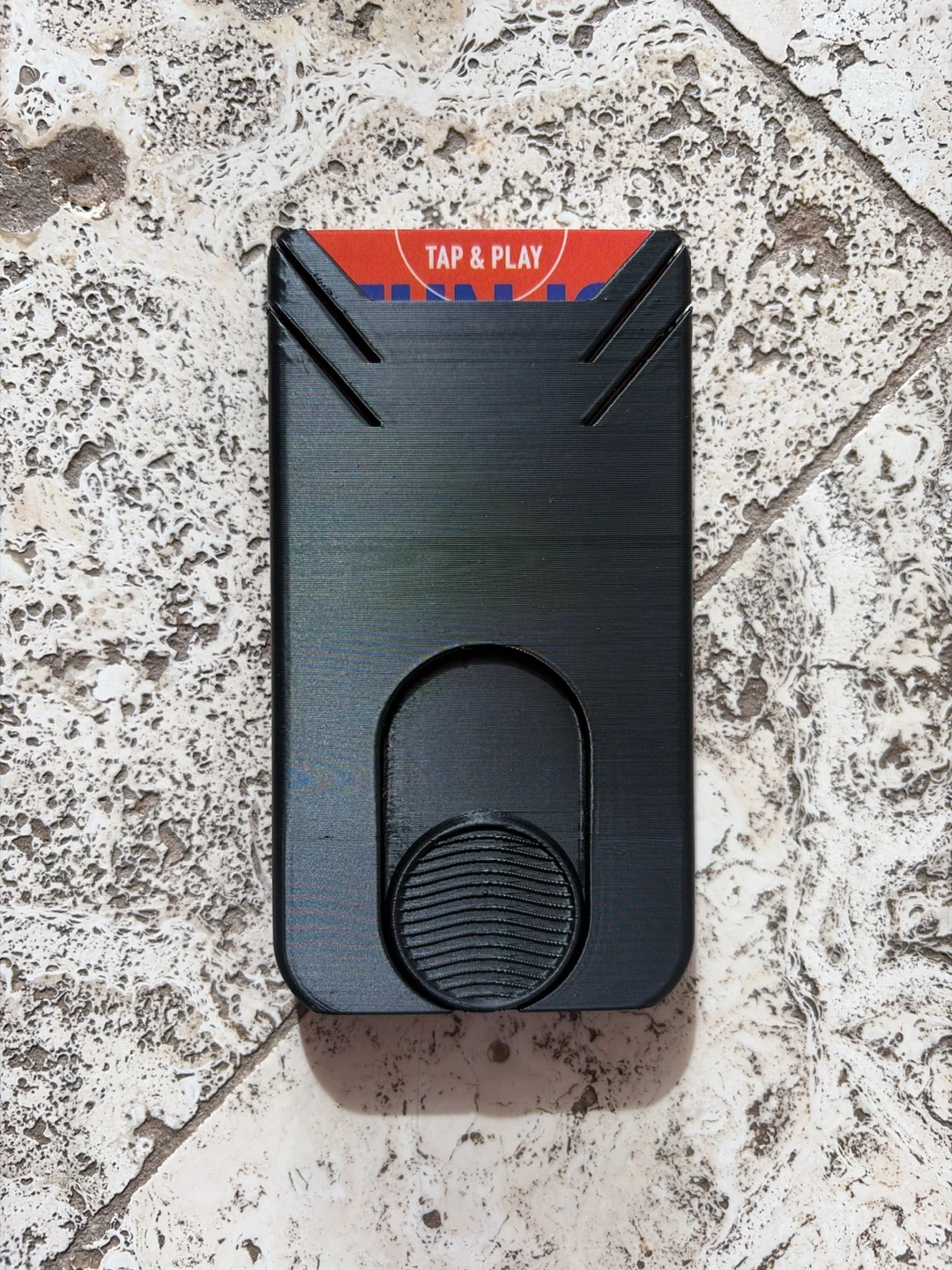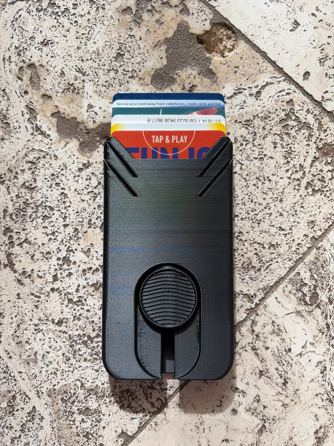 A sleek black card holder designed for minimalism. It securely stores your cards and features a pop-up mechanism for easy access. Made from durable plastic. 3d printed