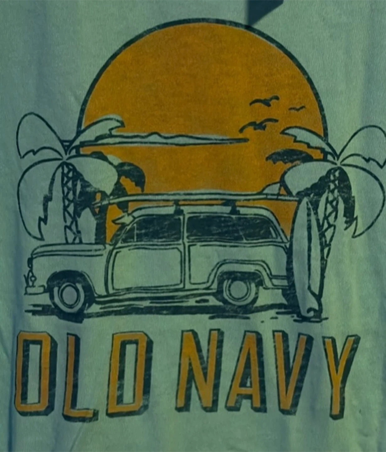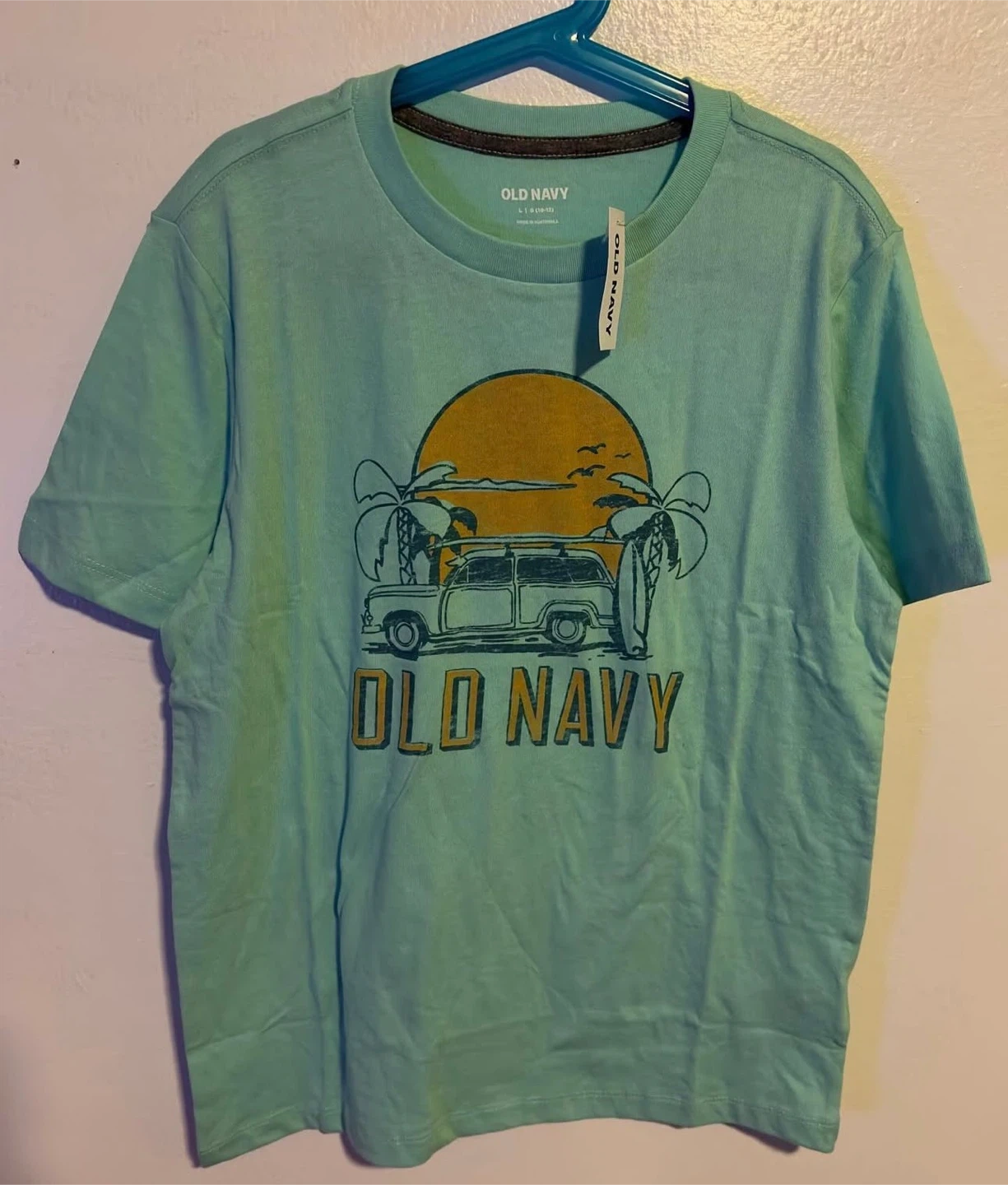 This is a light blue Old Navy t-shirt for boys in size L (10-12). It features a graphic print of a station wagon with surfboards and palm trees against a sunset. Made from soft cotton.