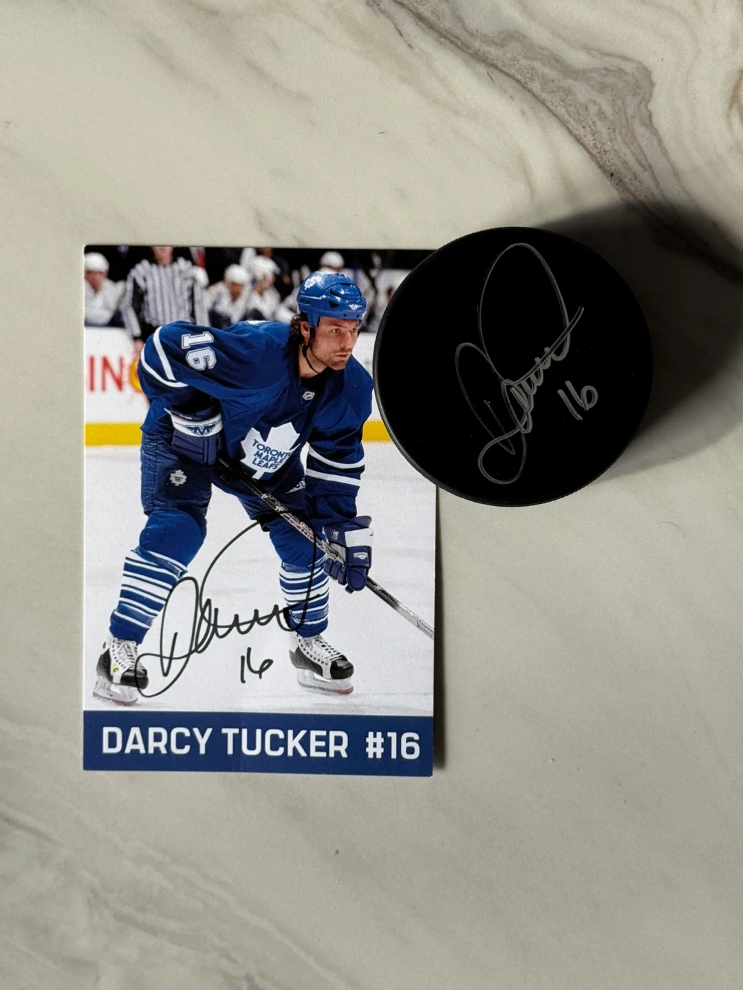 Signed hockey puck and trading card featuring Darcy Tucker of the Toronto Maple Leafs. The card shows him in his blue Leafs jersey, and both items are autographed. Both items have Darcy Tucker's signature. Perfect for any Leafs fan or hockey memorabilia collector!
