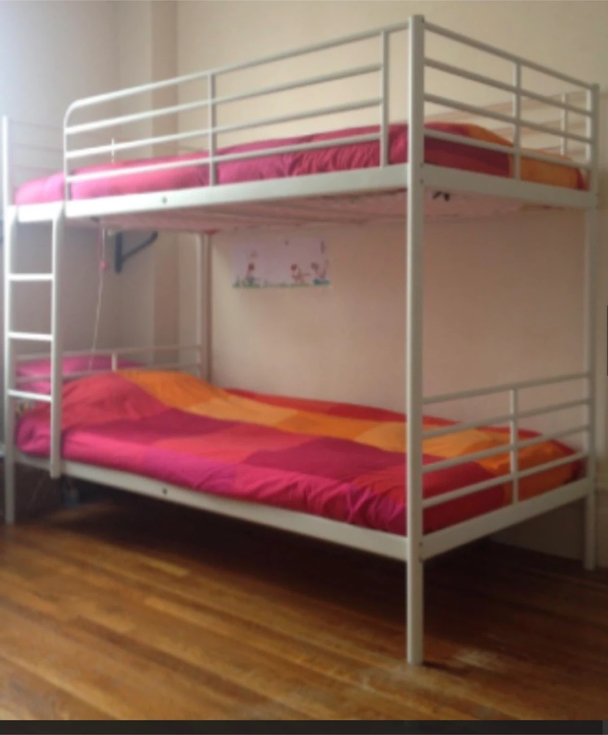 This is a sturdy white metal bunk bed, perfect for saving space in kids' rooms or guest bedrooms. The frame is made of durable metal. There is a defective weld point as shown in the photos, but the bed is still functional/being.