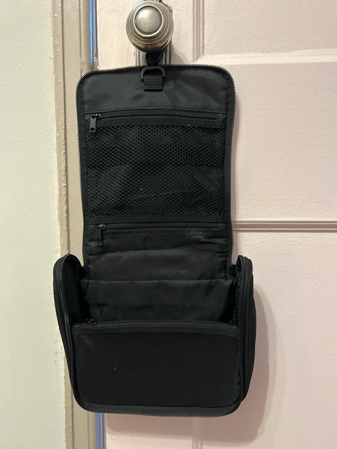 This is a handy black hanging toiletry bag. It has multiple compartments to keep your toiletries organized while travelling or at home. It is in great condition and ready for your next trip.