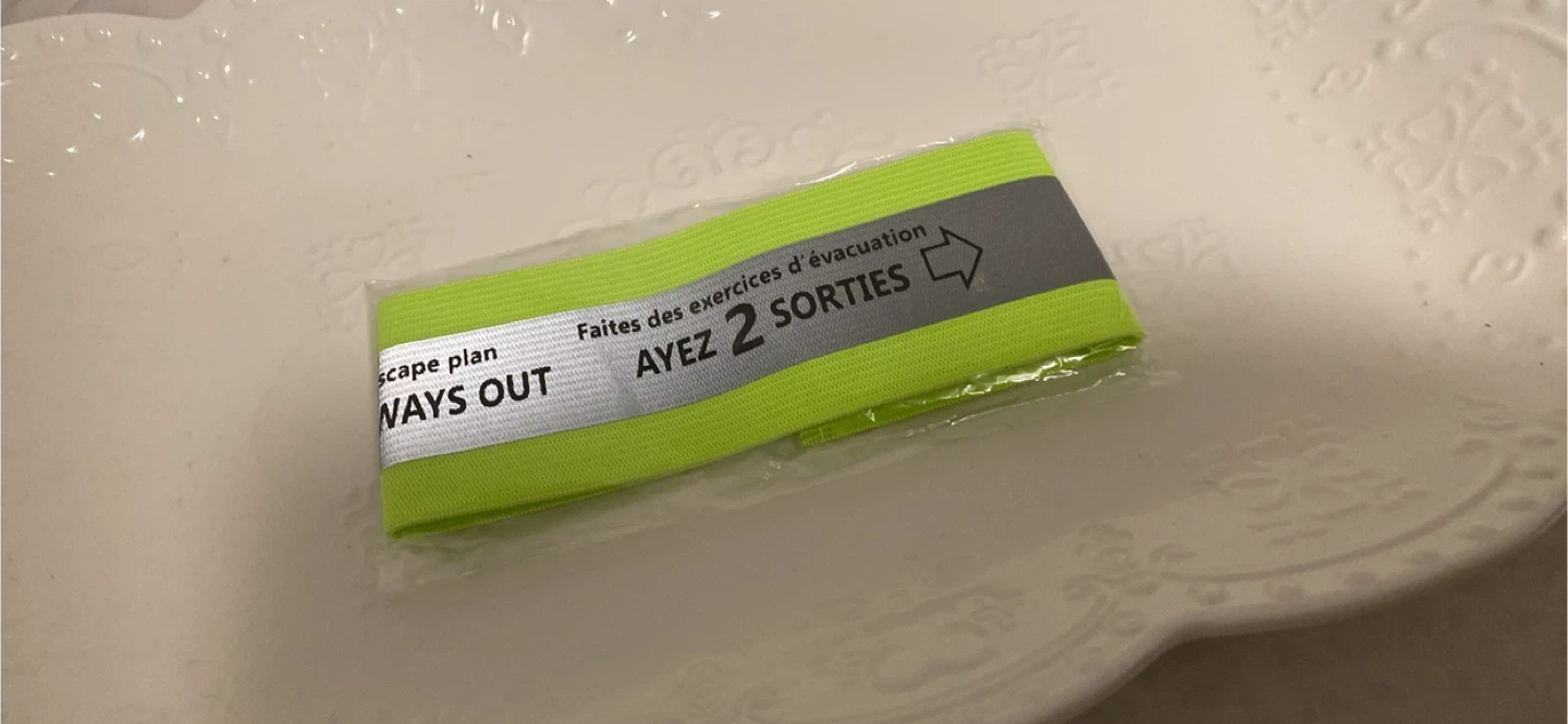 This elastic band is designed to help with safety planning. It features reflective stripes and text in both English and French, reminding you to "HAVE 2 WAYS OUT" and "AYEZ 2 SORTIES". It's a simple tool for escape plan exercises and fire preparedness. Elastic band with reflective detailing.